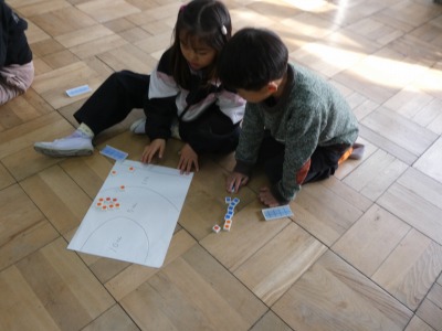 1年生の算数で、「大きいかず」の単元の学習が進んでいます。この単元では、100までの数について扱います。今日は、ゲームを通して、100までの数の大小について考えました。「10がいくつと、1がいくつ」という10進法の考え方を基にした大小比較を、楽しみながら学んでいます。