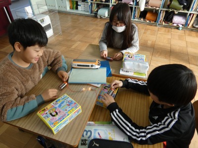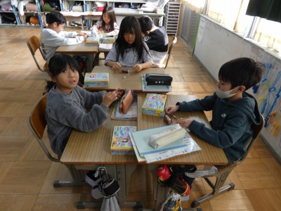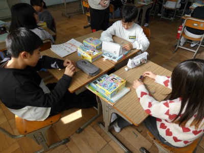 3年生の理科で、「電気の通り道」の単元の学習が始まっています。身近にある電気について学習する単元です。今日は、実際に乾電池に豆電球をつないで、明かりをつけてみました。実際にやってみることで、乾電池の+極と-極に導線をつなぐ必要があることが実感できますね。