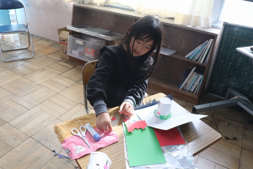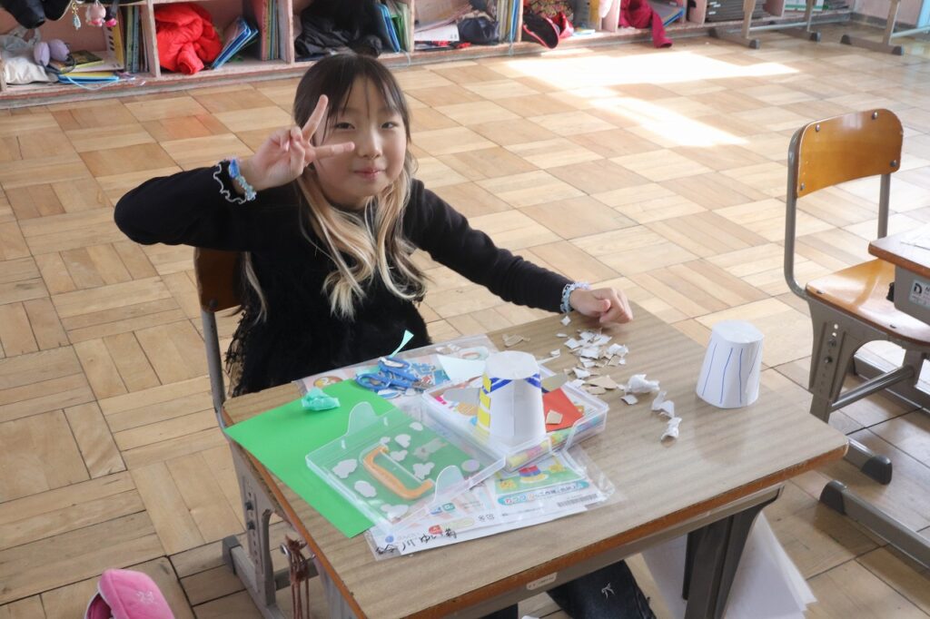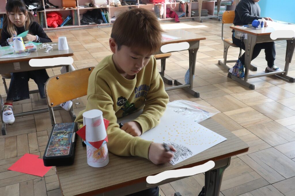2年生の図工で、紙コップと輪ゴムを使って、紙コップをつぶして手をはなすと、びょーんと元にもどる作品をつくりました。みんな楽しそうにつくっていました。