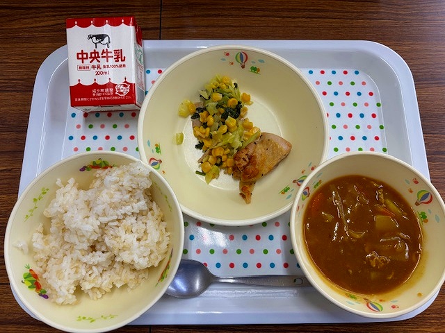 <献立> ロウカット玄米ごはん、牛乳、カレーライス、鶏肉の香味焼き、野菜のソテー