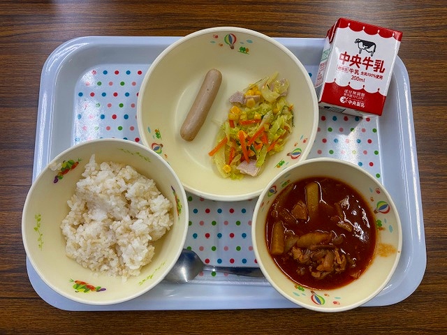 〈献立〉ロウカット玄米ごはん、牛乳、ハヤシライス、愛知ウインナー、根菜と水菜のサラダ