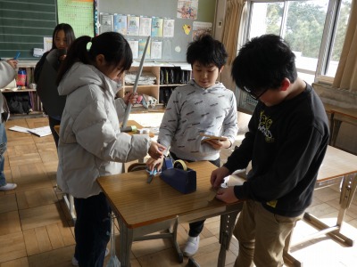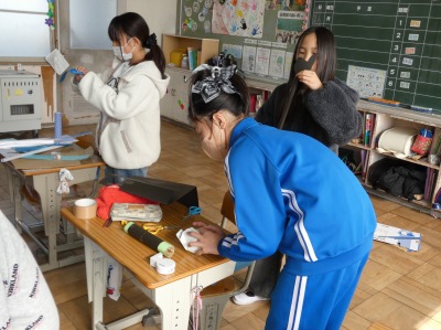 4年生の教室をのぞくと、みんなで何かを作っています。2月に行われる学習発表会に向けて、発表をするときに使う指示棒などの道具を作っていました。発表を聞く人に分かりやすく伝えるために、工夫して準備を進めています。