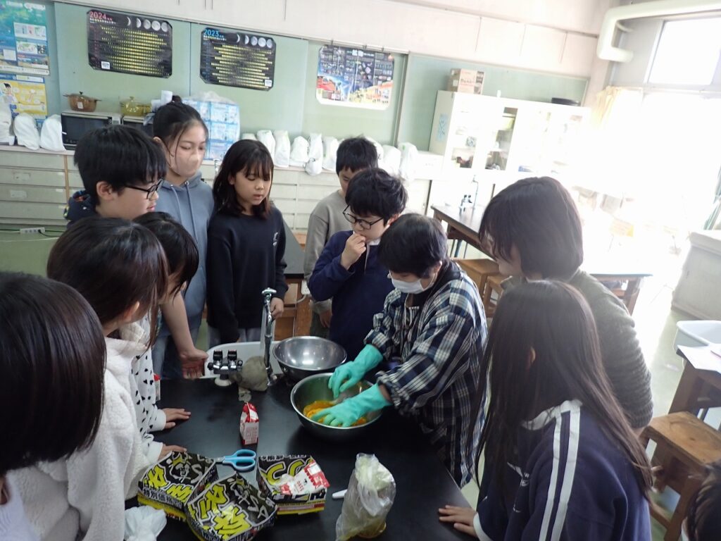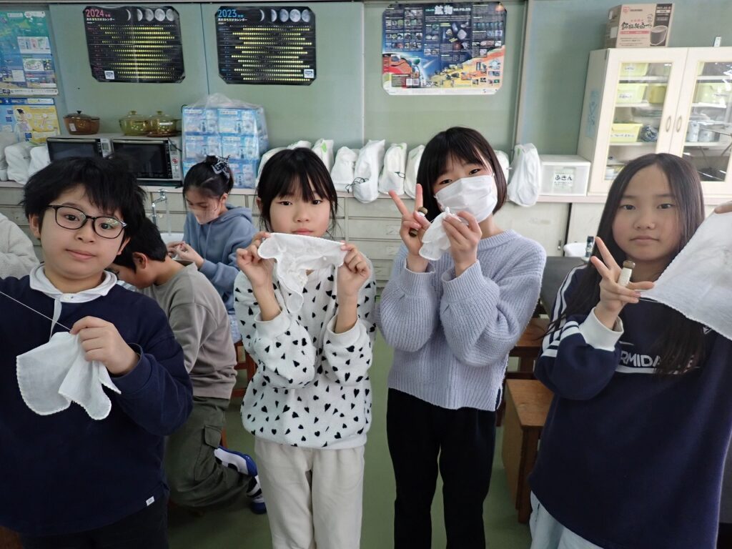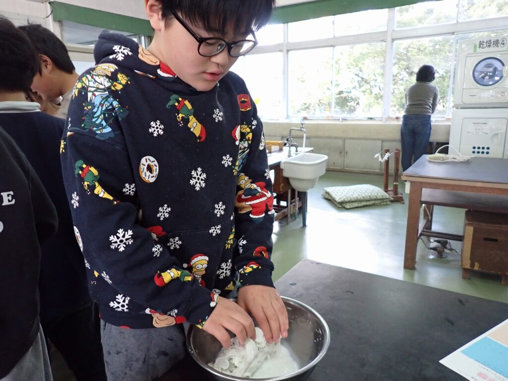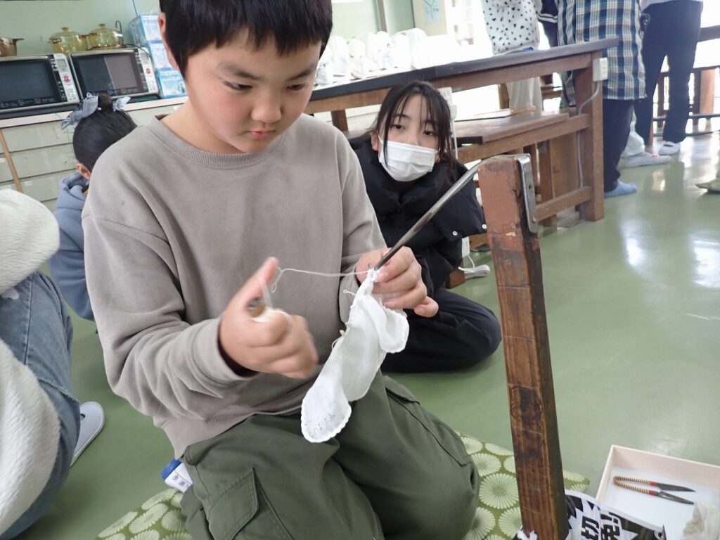 今日は地域の伝統産業を学ぶために日間賀島で受け継げられてきた「板子しぼり」の体験をしました。事前学習で調べたことを思い出しながら、実際のしぼりの歴史や絞り方を学びました。今回はしぼり台を使い、世界に一つだけのハンカチを作りました。細かい作業でしたが、上手に絞ることができましたね。