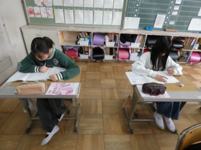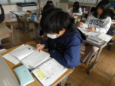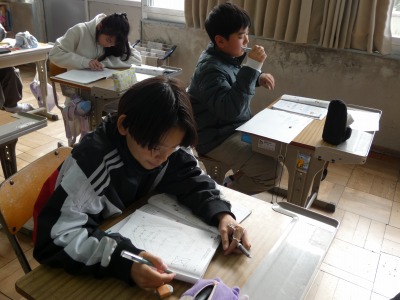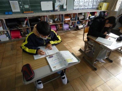 6年生の教室をのぞくと、算数の問題に取り組んでいました。5つの地点をぐるっと回って元に戻る場合の条件を整理し、最も道のりが短くなる進み方を求める問題です。樹形図をかいて進み方を整理しながら考えています。過不足なく進み方を整理するには、図を使うことが有効ですね。