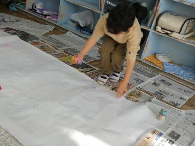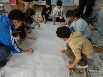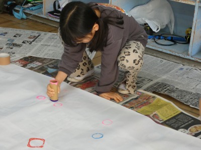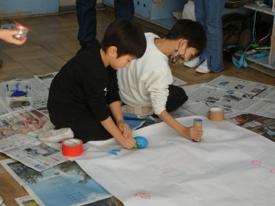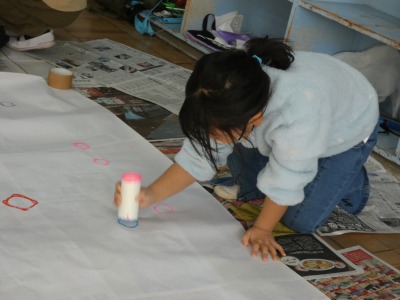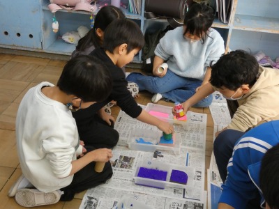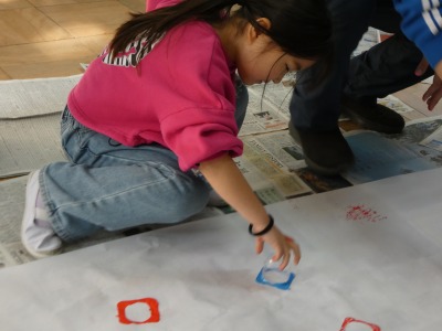 1年生の図工で、「ぺったん コロコロ」という制作に取り組んでいました。いろいろな物に絵の具をつけ、紙に写して作品にします。物の形や凹凸によって、いろいろな形が表現できます。「ぺったん」と押しつけたり、「コロコロ」と転がしたりして写される形を楽しんでいます。