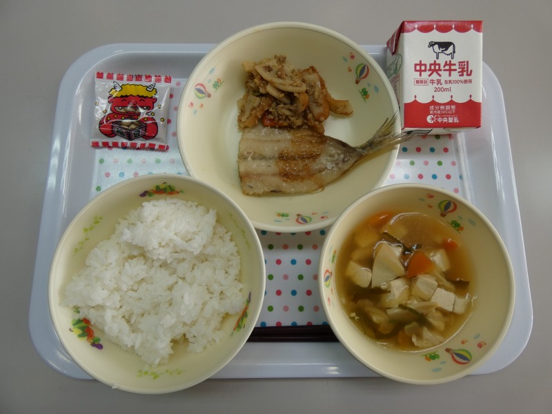 <献立> ごはん、牛乳、いわしの蒲焼き、れんこんのきんぴら、豆腐のすまし汁、節分豆