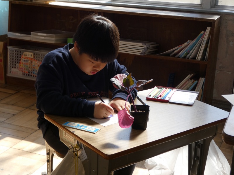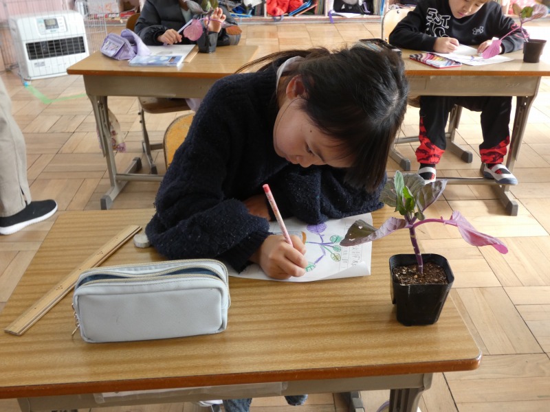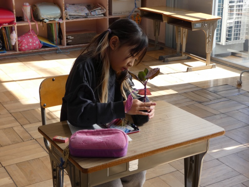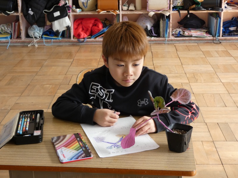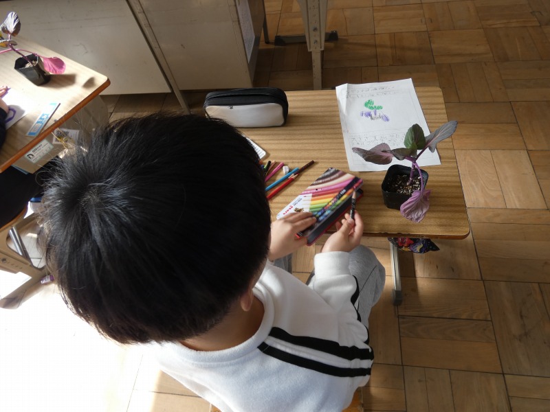 2年生の生活科で、キャベツを育てます。今日は、苗を植える前に、まず観察をしました。形や色、大きさ、数などに着目して言葉で記録し、絵も使ってまとめています。