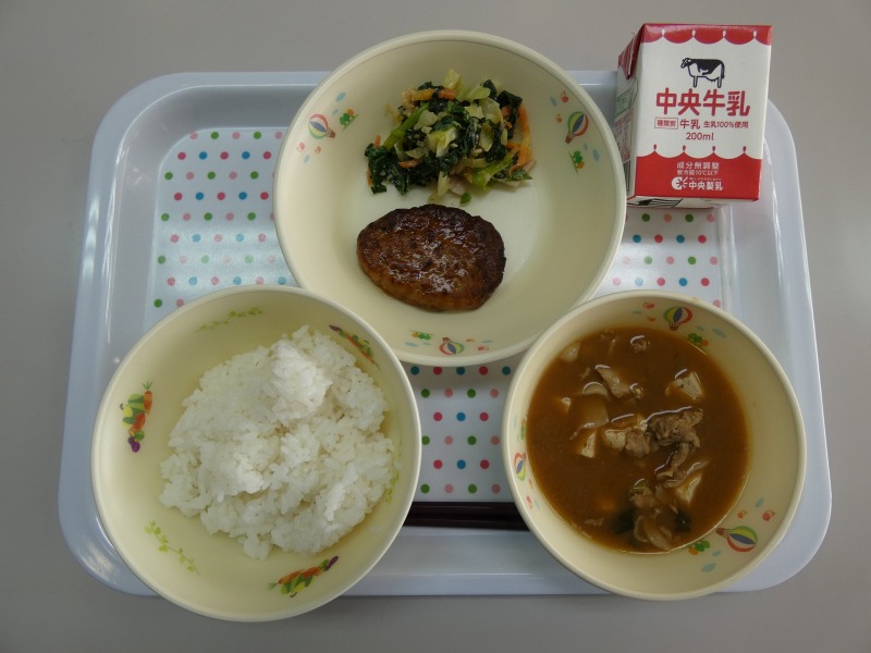 <献立> ごはん、牛乳、照り焼きハンバーグ、ほうれん草のごま和え、根菜のみそ汁