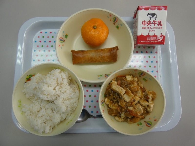 <献立> 麦ごはん、牛乳、春巻き、麻婆豆腐、みかん