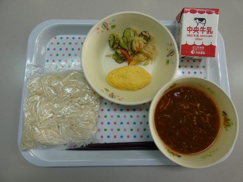 <献立> ソフトめん、牛乳、ミートソース、オムレツ、マリネサラダ