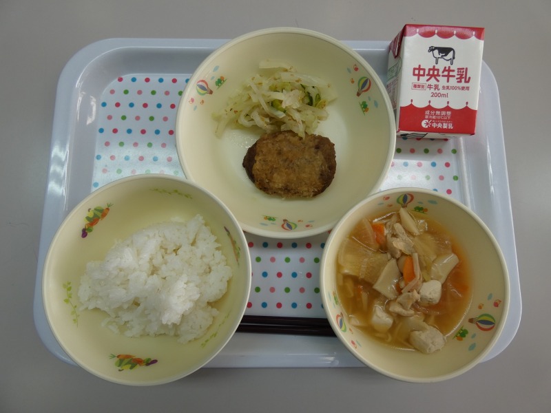<献立> ごはん、牛乳、ハンバーグのおろしかけ、野菜の香の物和え、玉麩汁