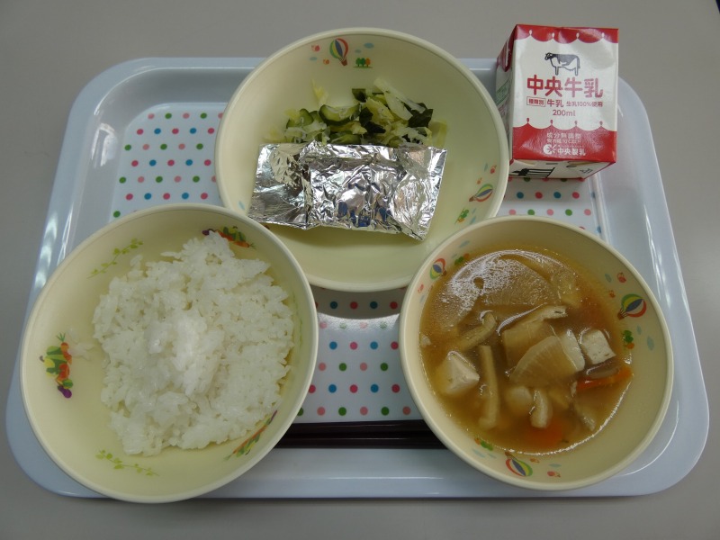 <献立> ごはん、牛乳、さばの銀紙焼、しらす干しとわかめの酢の物、けんちん汁