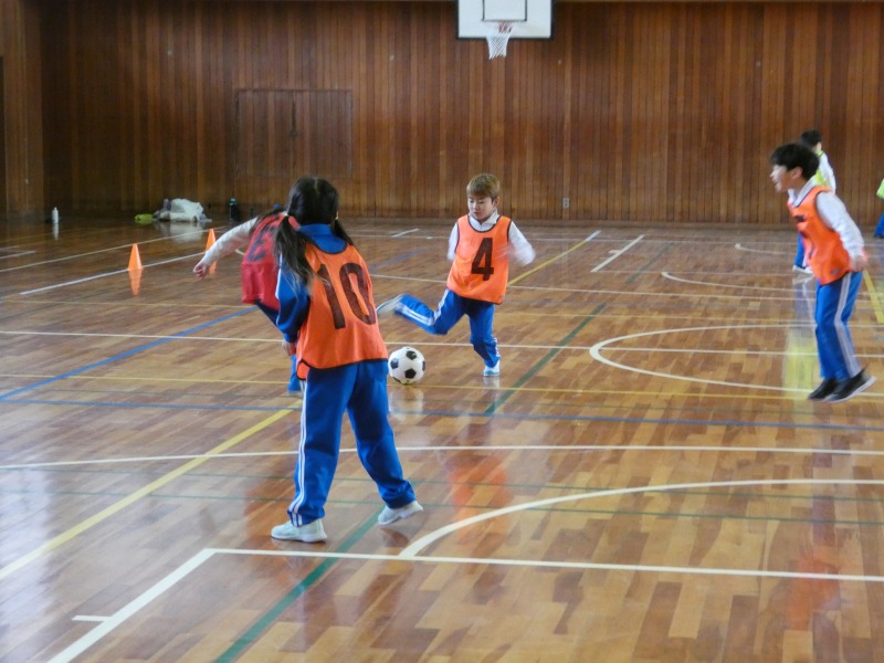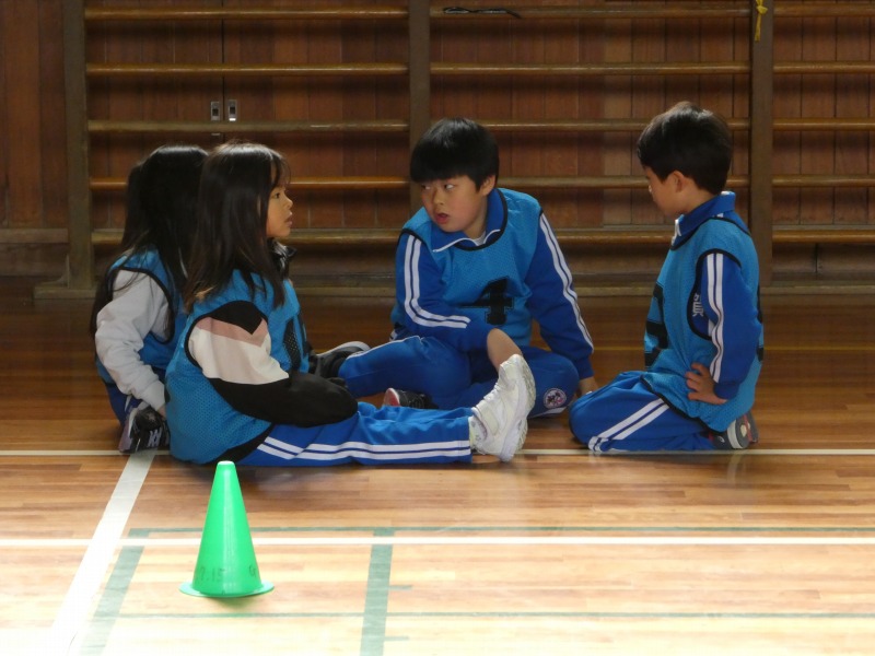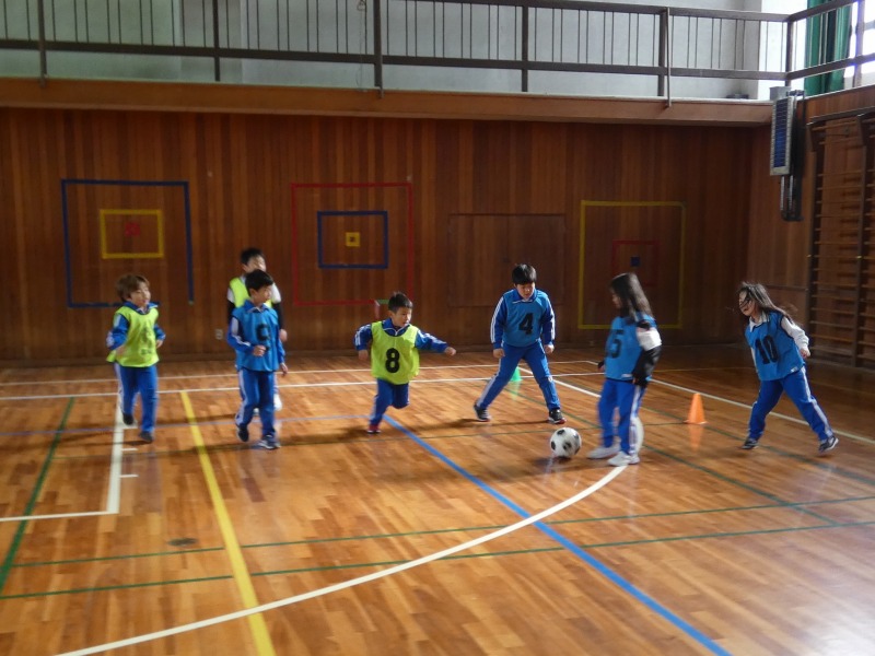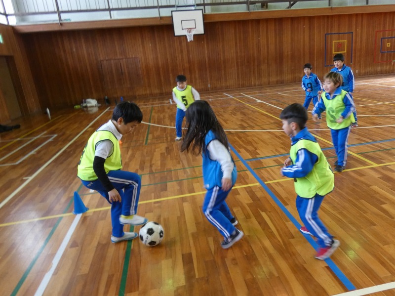 体育館をのぞくと、1年生、2年生が、体育の授業でミニサッカーをしていました。4つのチームに分かれて、作戦会議も行っています。みんなで楽しそうに体を動かしています。「楽しんで運動する」ということは、将来に向けて大切ですね。