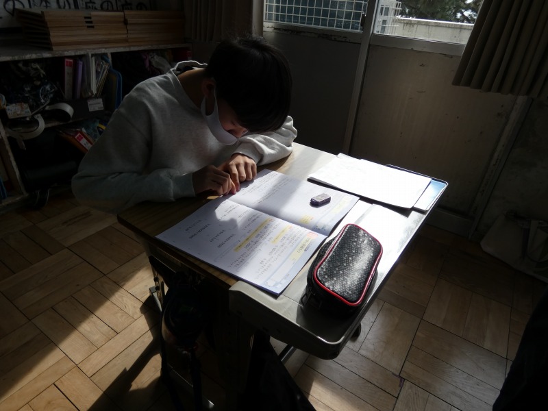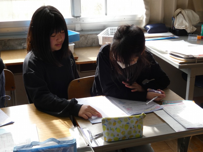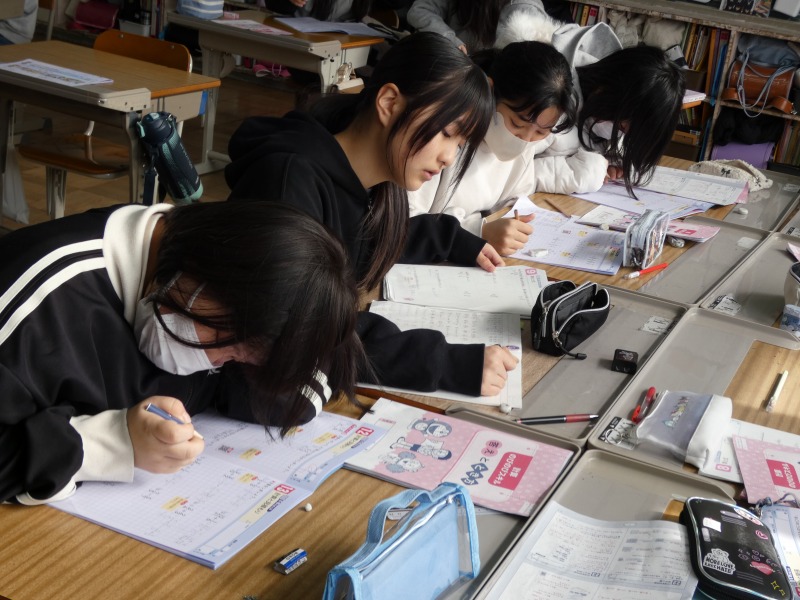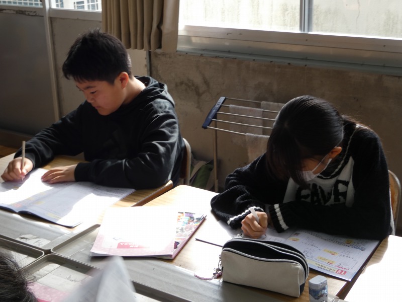 6年生の教室をのぞくと、算数の復習をしていました。6年生に学習した内容に関する問題を解いています。必要に応じて、周りの仲間と相談しながら復習に取り組んでいます。