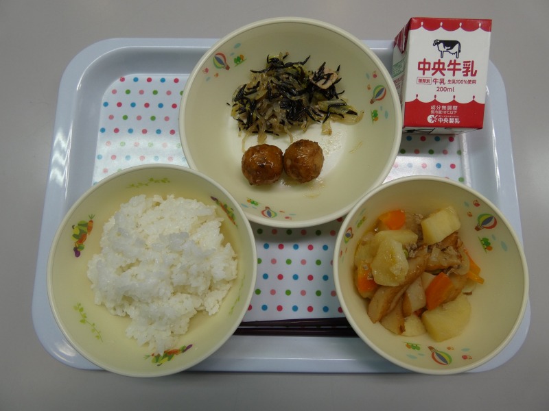 <献立> ごはん、牛乳、愛知のれんこん入りつくね、じゃがいものそぼろ煮、ひじきと春雨のごま酢和え