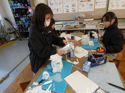 5年生の図工で、「紙から生まれるすてきな明かり」の制作に取り組んできました。和紙を丸めて立て、中から光を当てたときの紙の見え方を生かして作品にしています。もうすぐ完成です。