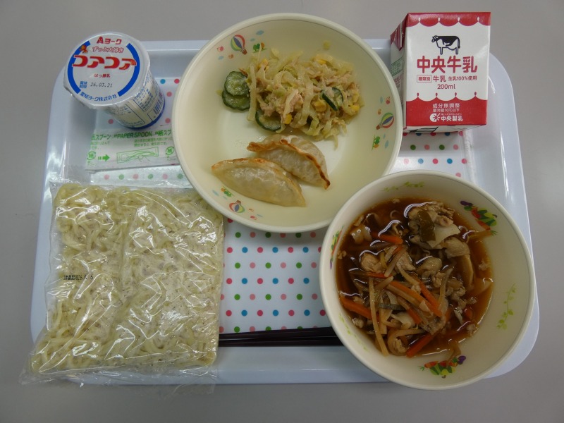 <献立> 中華めん、牛乳、たまり醤油ラーメン、焼き餃子の辛子醤油かけ、棒棒鶏サラダ、ヨーグルト