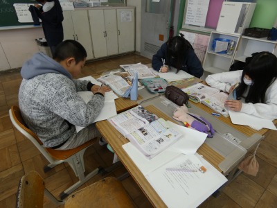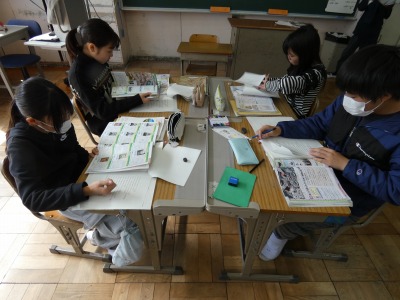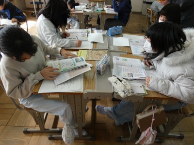 6年生の社会で、1年間の学習の復習を続けています。今日は、歴史の分野で、江戸時代から近代までの内容です。教科書などを使って確認し、学習したことを思い出しながらまとめています。