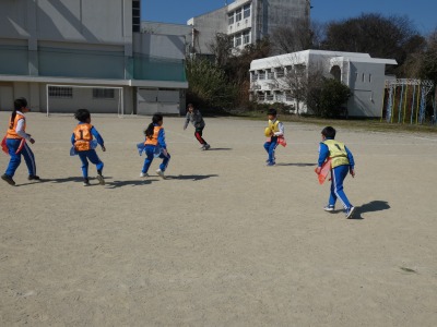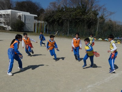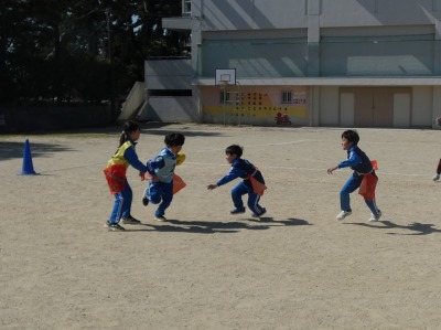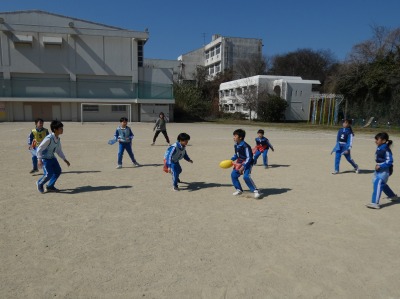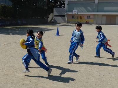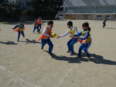 グラウンドから、「タグ!」という大きな声が聞こえてきました。3年生の体育で、タグラグビーをしていました。基本的なルールはラグビーと同じで、「タックルの代わりに腰につけているタグをとる」という競技です。とても楽しそうに運動をしています。