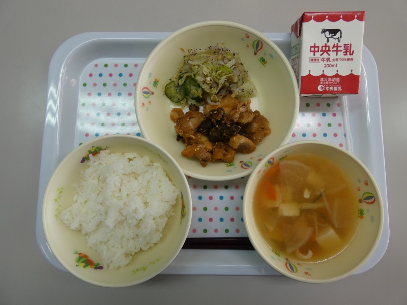 <献立> ごはん、牛乳、鶏肉の胡麻よごし、ゆかり和え、湯葉と豆腐のすまし汁