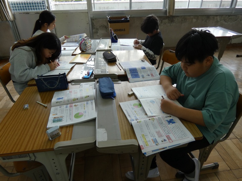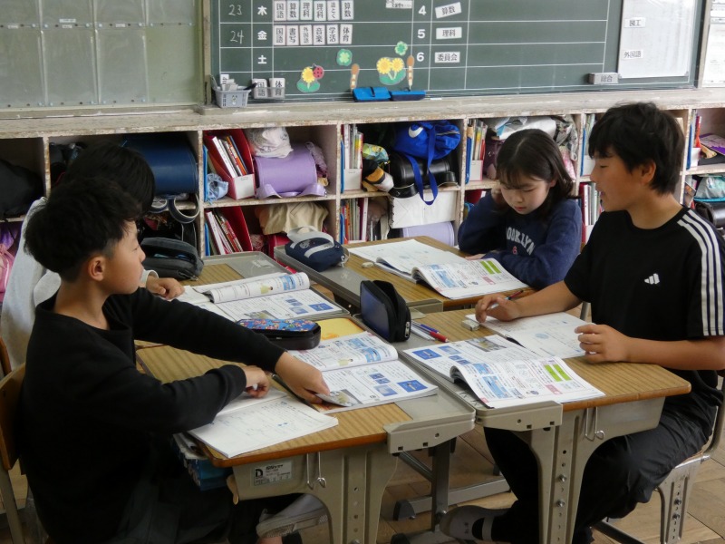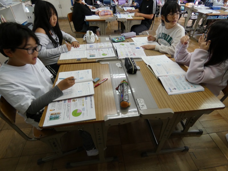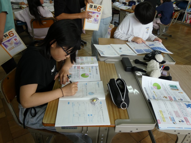 6年生の理科で、「ものの燃え方と空気」の単元の学習が始まっています。今日は、空気中にある酸素、窒素、二酸化炭素の中で、ものを燃やす働きがある気体を予想し、実験の計画を考えました。必要に応じて、近くの仲間と相談しながら進めています。