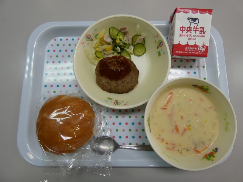 <献立> サンドイッチバンズパン、牛乳、ハンバーグのケチャップソースかけ、コールスローサラダ、コーンポタージュスープ
