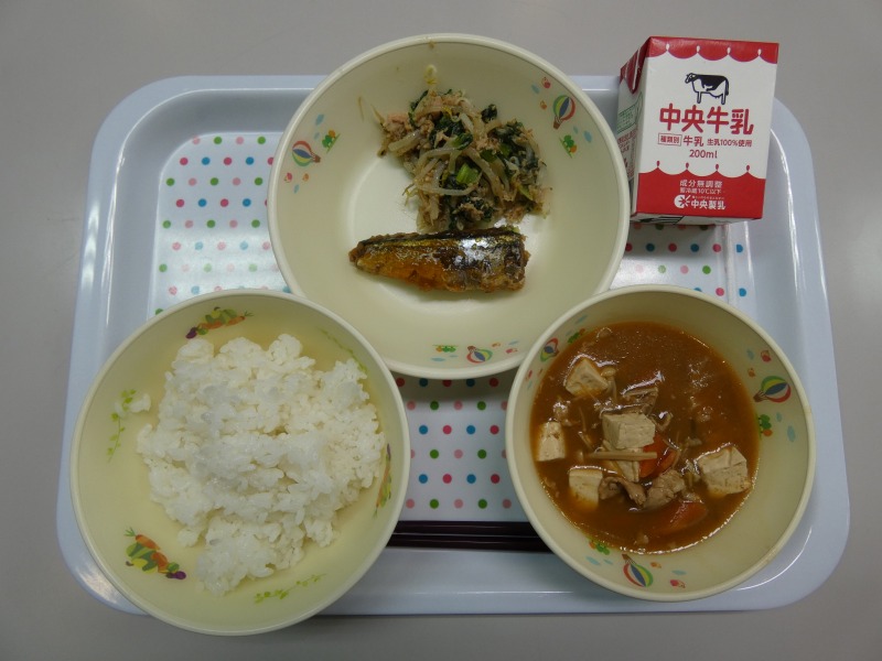 <献立> ごはん、牛乳、さんまのみぞれ煮、磯香和え、豚汁