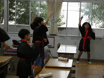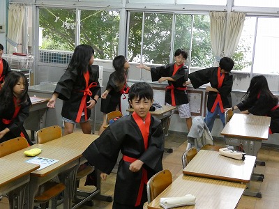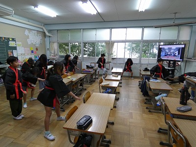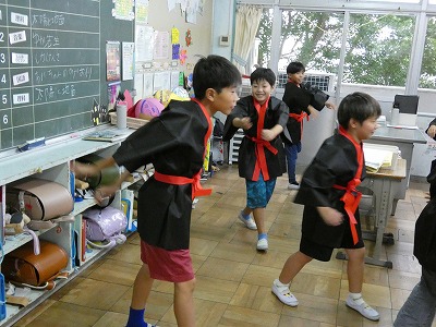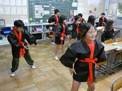 3年生の教室をのぞくと、島民体育祭で踊るソーラン節の衣装を確認していました。実際に着てみて、そのまま踊ってみました。本番が近づき、気持ちが高まってきますね。