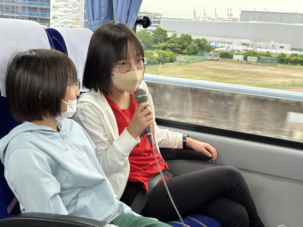 バス車内で篠島小学校のみんなと交流しています。