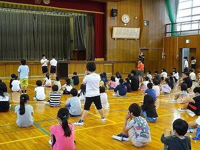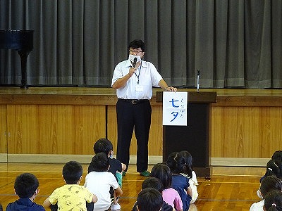 行事の都合により昨日できなかった朝会を、今朝行いました。校長先生からは、七夕にまつわる星座の話をしていただきました。また、児童会からは、先日行われたあいさつ運動で、すばらしいあいさつのできた通学班の表彰がありました。