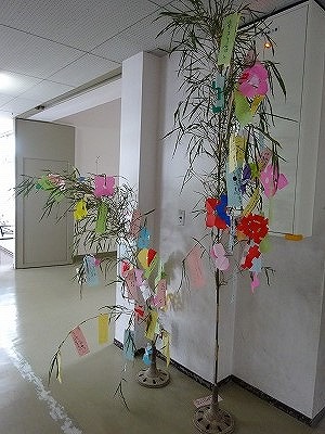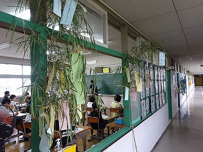今日は「七夕」ということで、各教室前のろうかには、児童たちの願い事が書かれた短冊が飾られていました。
