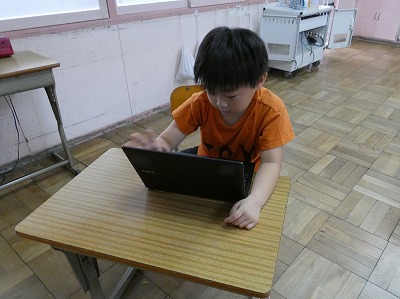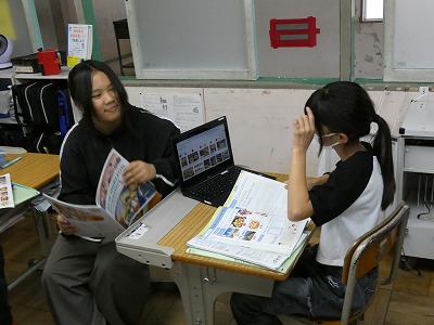 6年生の外国語の授業で、“can”を使って、ある国でできることを紹介するコミュニケーション活動に取り組んでいました。自分で国を決め、できることを調べ、英語で伝えています。