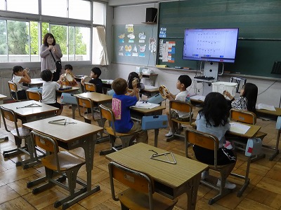 2年生の算数では、かけ算の学習が続いています。今日は、3の段の九九について考えました。「3の2つ分」など、かけ算の意味を考えながら、タブレットを使って整理しています。