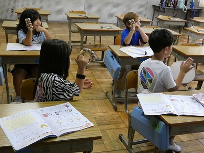 1年生の図工の授業で、「おって たてたら」の制作活動が始まりました。紙を切ったり、折ったりして、立てせてできる形から作品をイメージします。「ひまかランドをつくろう」というテーマで、一人一人がいろいろなものを制作し、教室の後ろにある「ひまかランド」のスペースに立てています。楽しそうに制作活動に取り組んでいます。