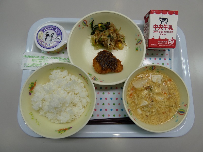 <献立> ごはん、牛乳、味噌カツ、野菜のおかか和え、かきたま汁、ブルーベリーゼリー
