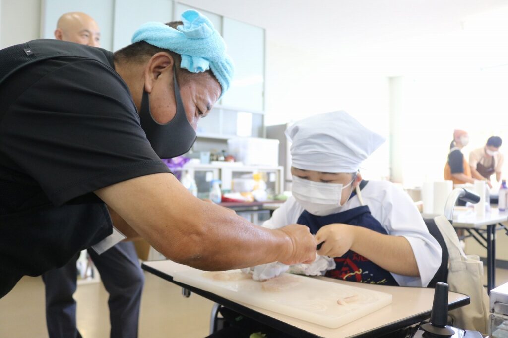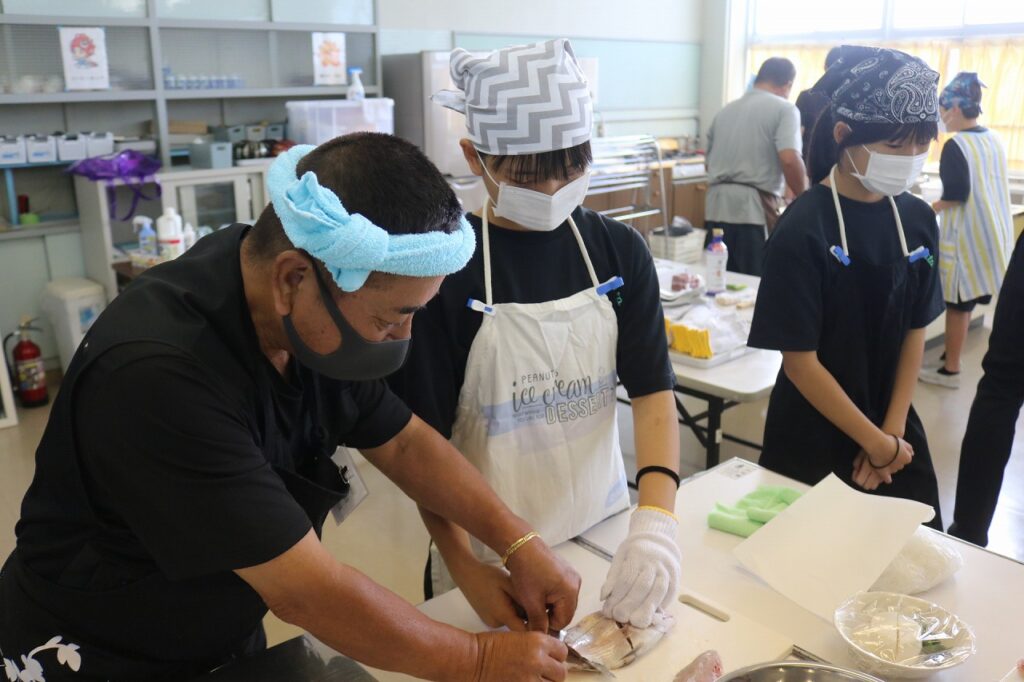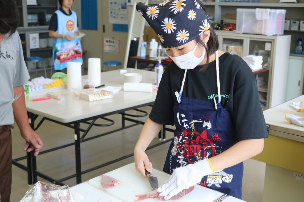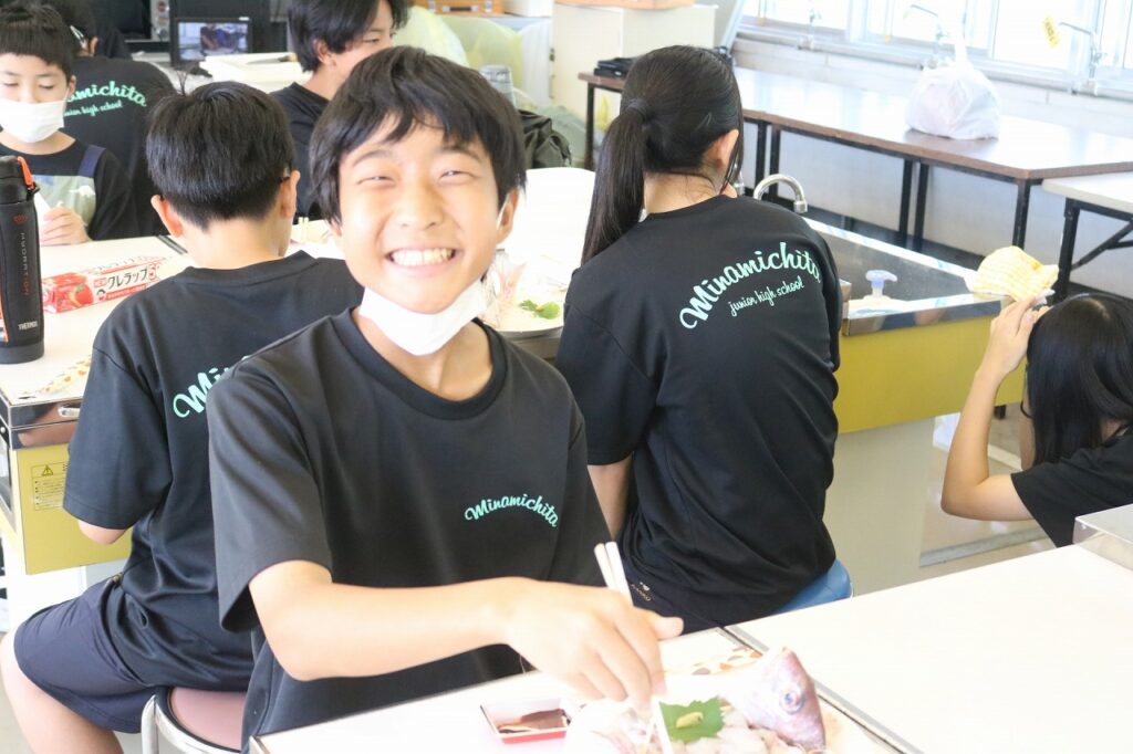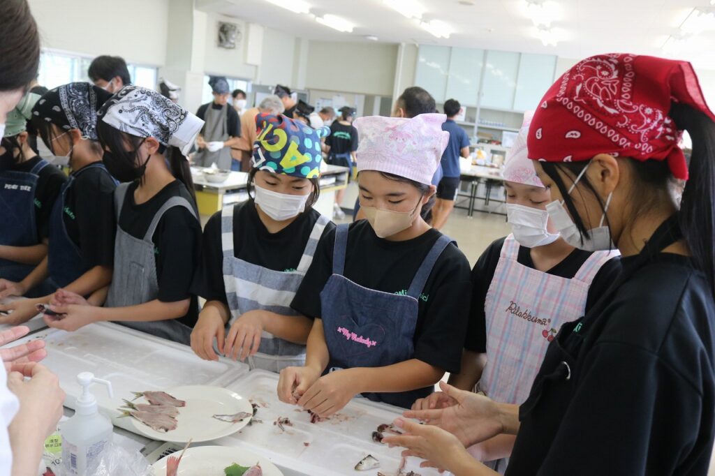 「漁業が盛んな南知多町に住む中学生に、魚を調理できる基礎的・基本的な技能を身に付ける」「地元の漁業関係者の方を講師としてお招きし、地域とのつながりや南知多町のよさに改めて気付く」ことを目的に、魚さばき教室を行いました。今年度も手の平サイズの鯛を三枚におろし、姿造りをつくりました。講師の方にサポートしていただき、全員が無事に捌くことができました。