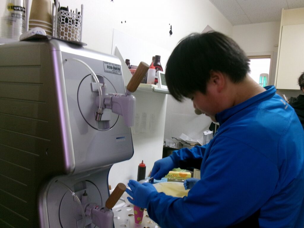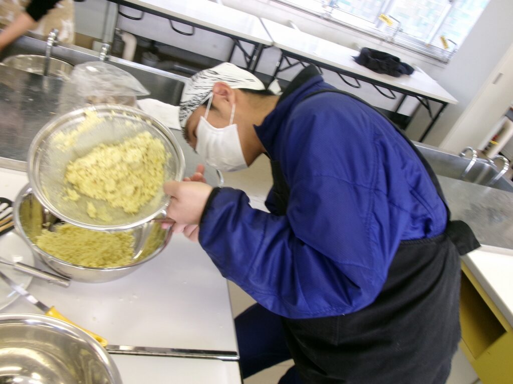 やわらかくしたさつま芋をマッシャーでつぶし、ざるで裏ごしをし、なめらかなクリーム状にしてカステラの上にしぼりました。かわいい「いもんぶらん」がたくさんできました。