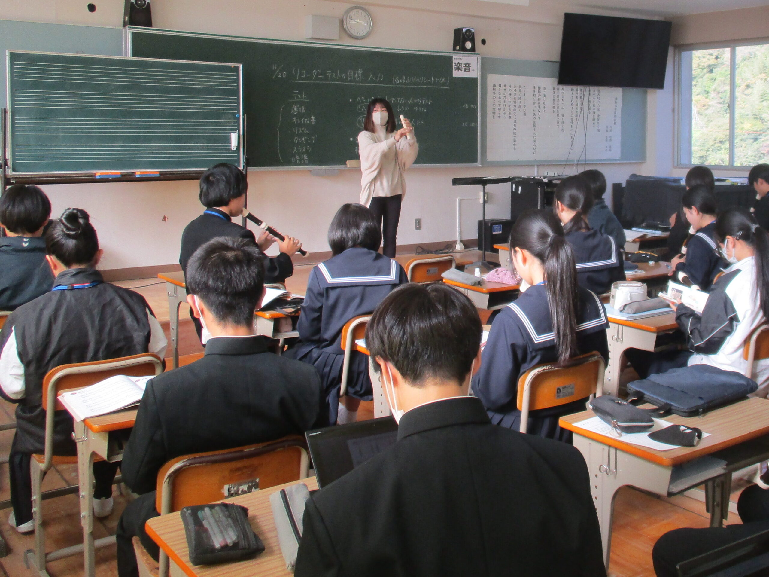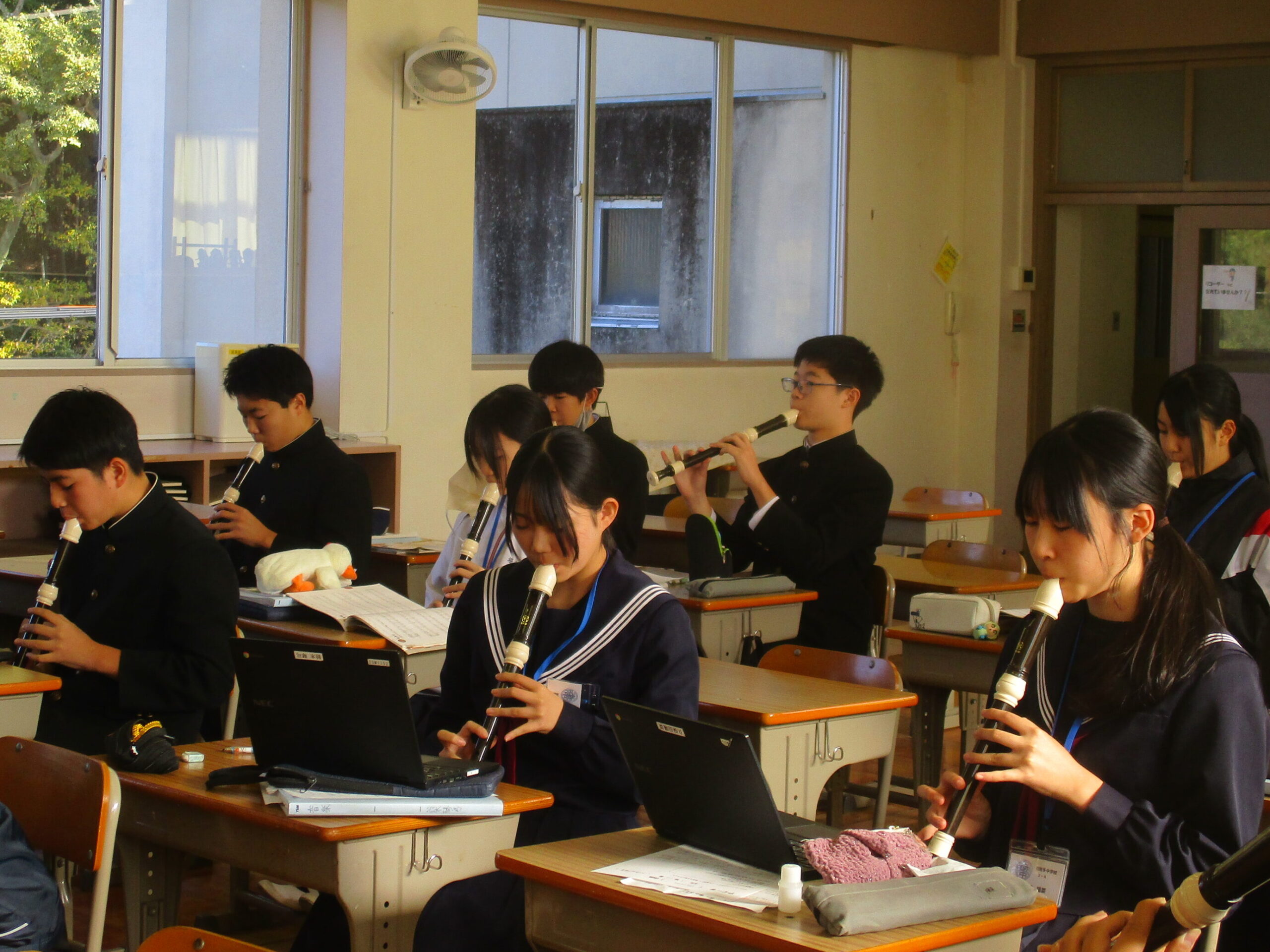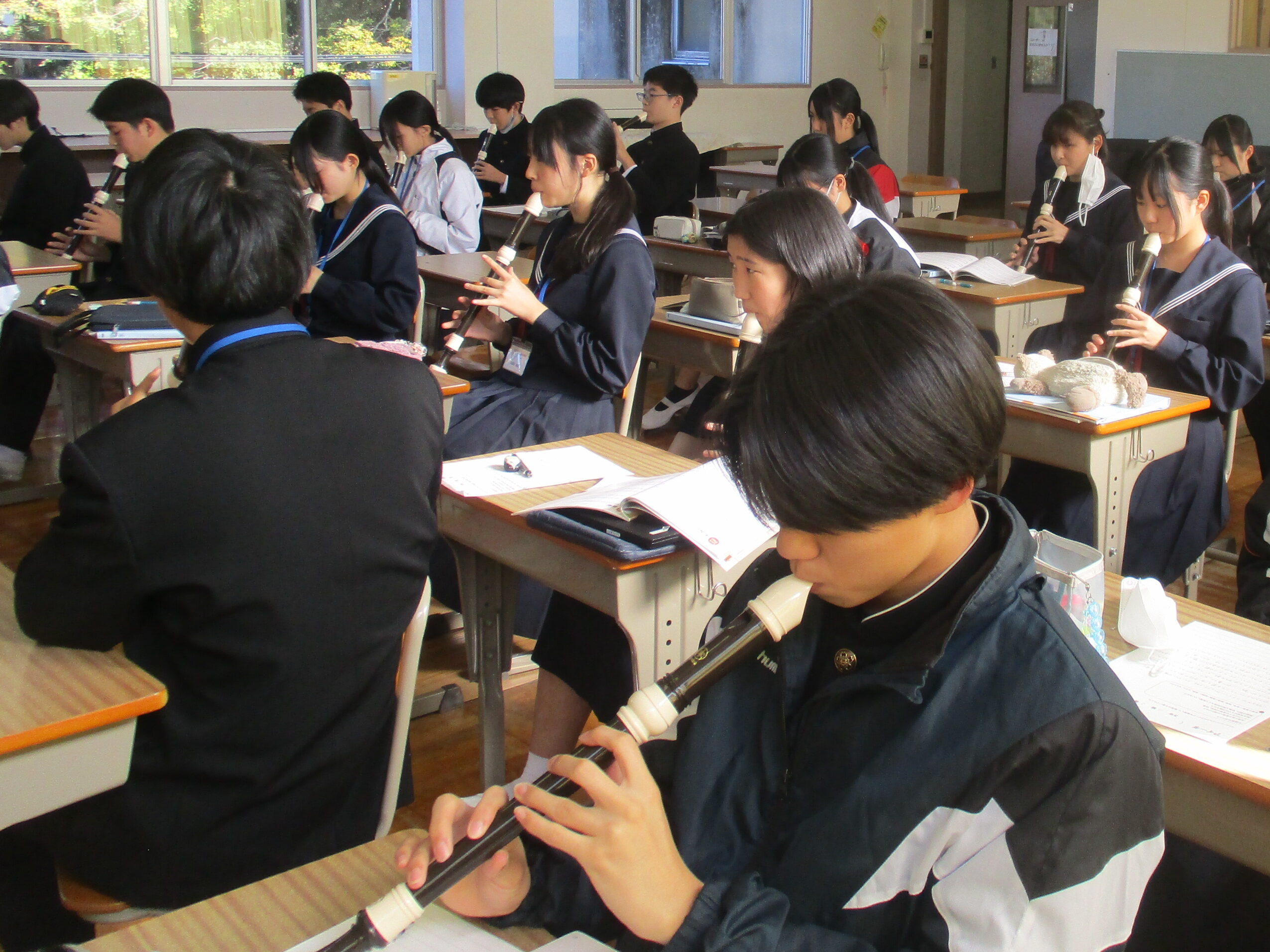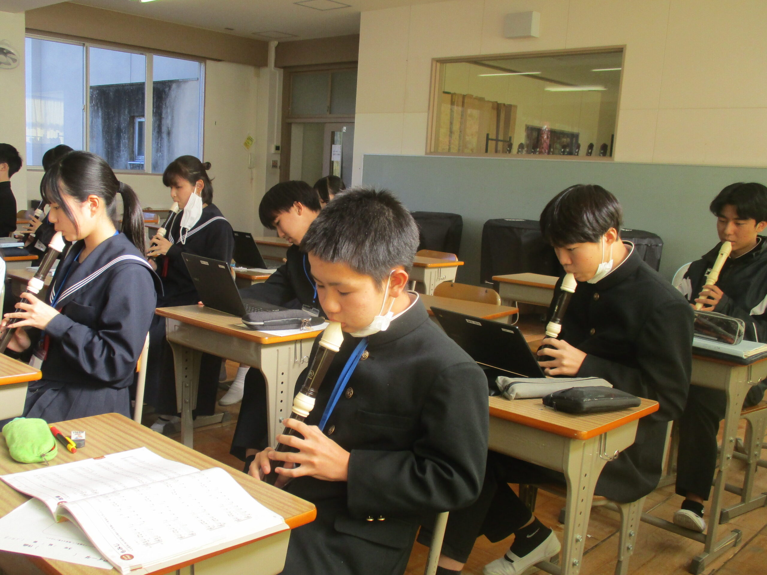 音楽の授業では、アルトリコーダーで「海」を演奏していました。指使いが難しいため、みんなで確認しながら完成度を高めていました。