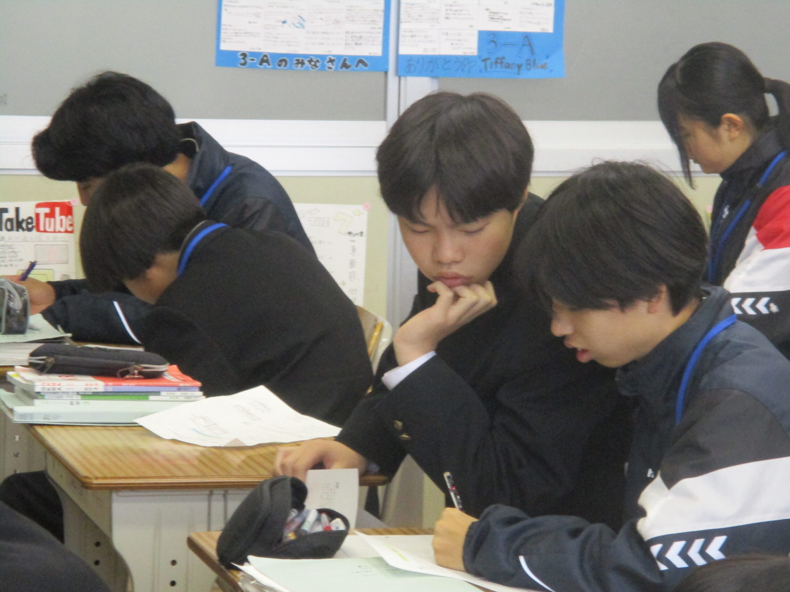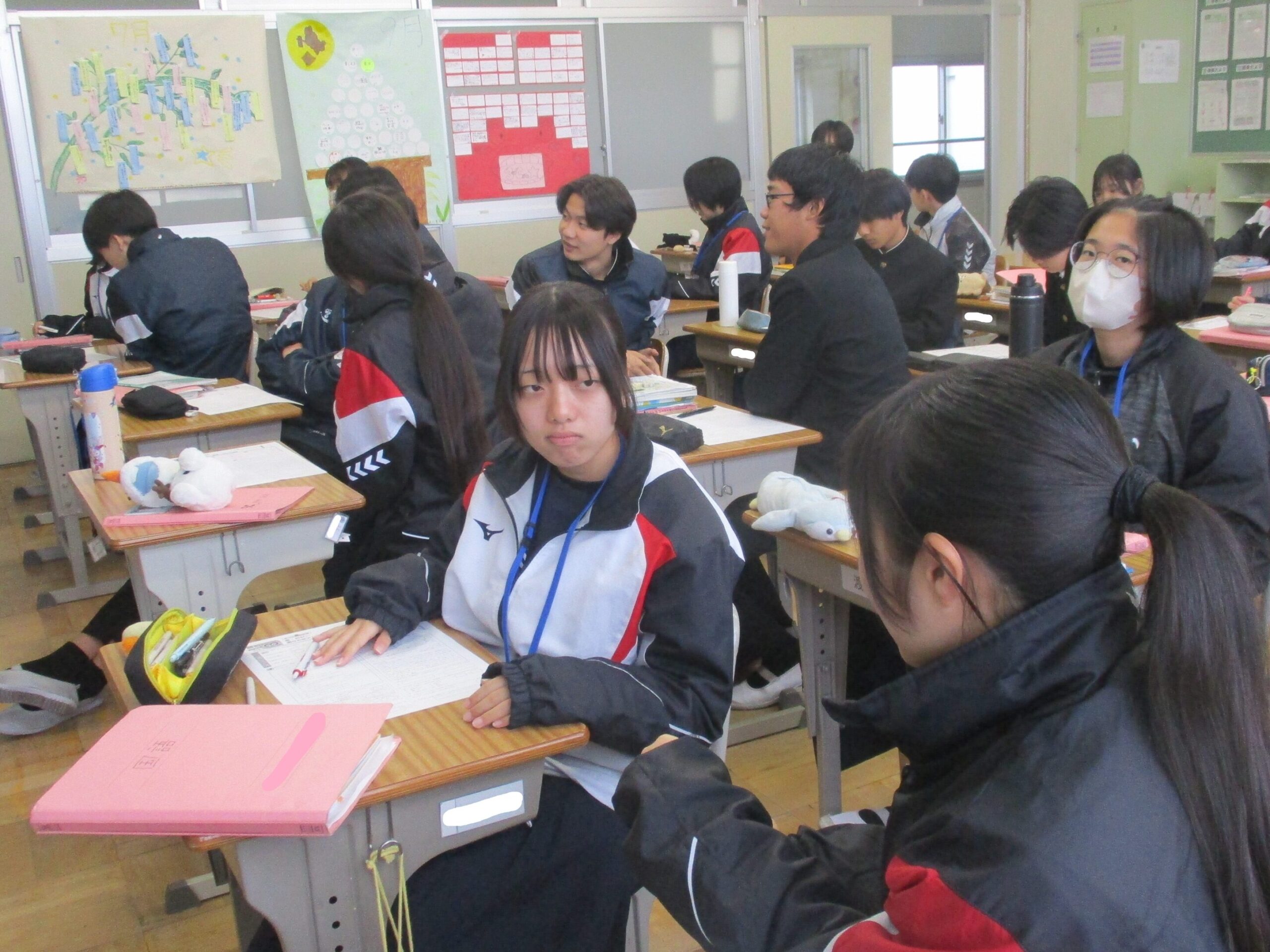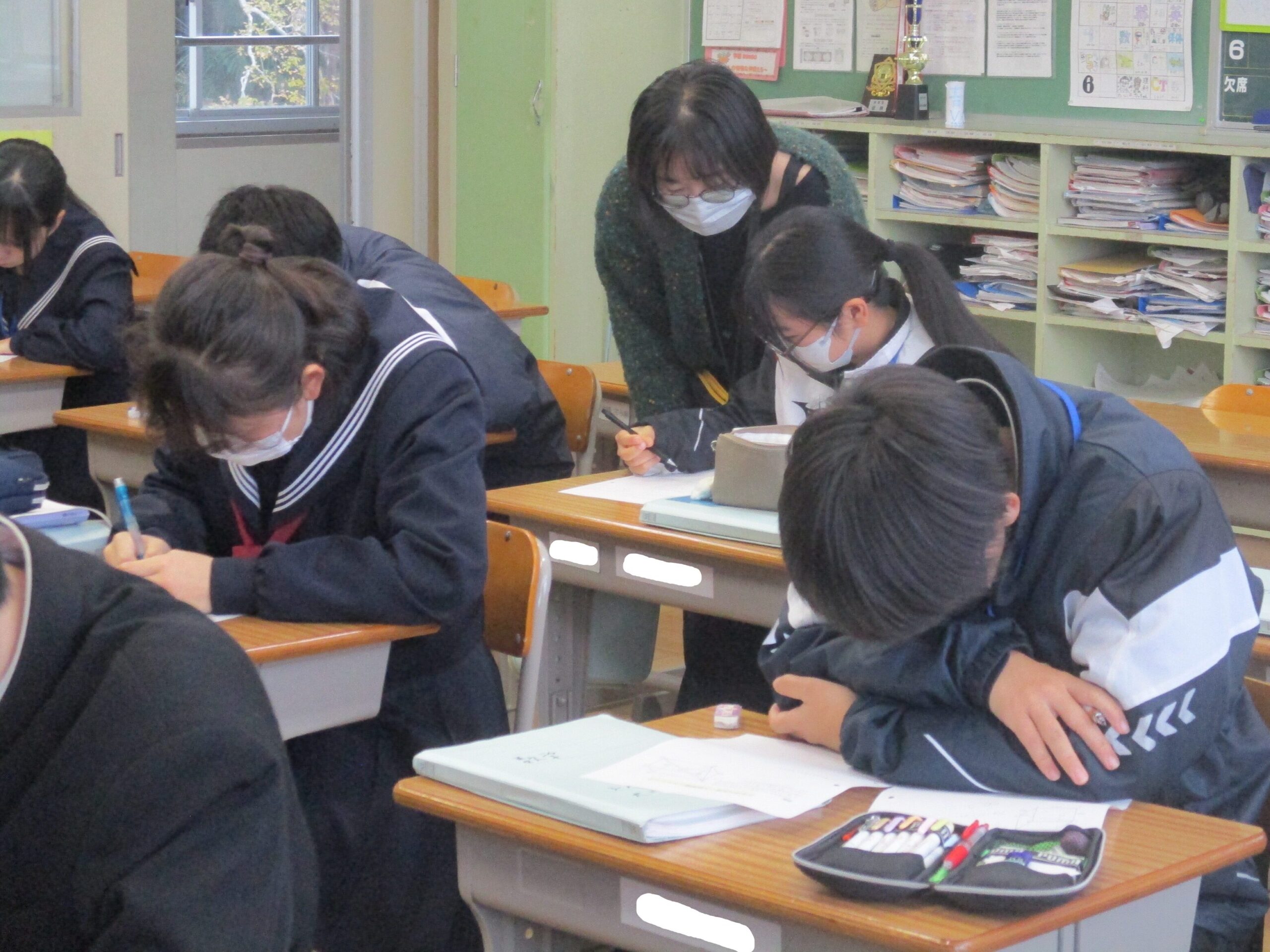 1時間目の様子です。A組は数学で、三平方の定理を使って問題を解いていました。図形をいろいろな角度から見て、一生懸命答えを出そうとしていました。B組は長距離走のトレーニングをしました。指示されたペースに合わせて走ることで、ペース変化に順応できるよう練習しました。C組は国語で、文の種類や擬態語と擬音の違いなどを確認していました。