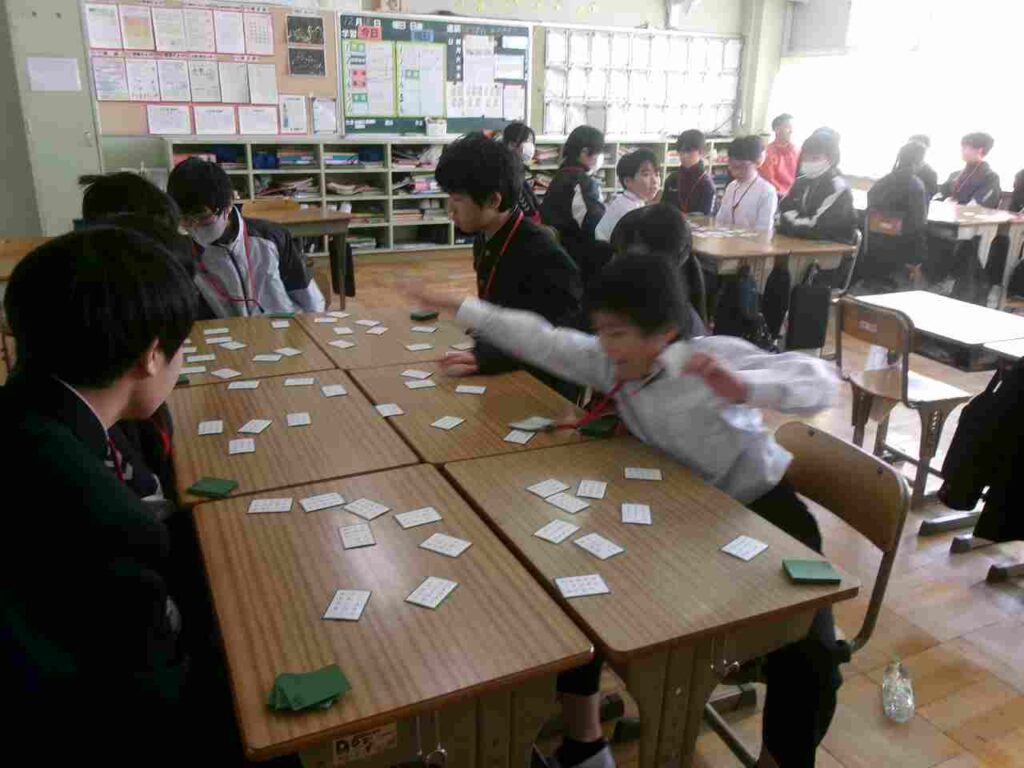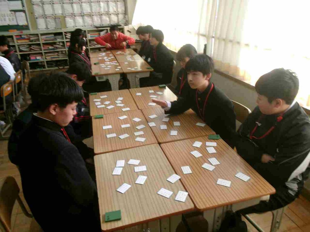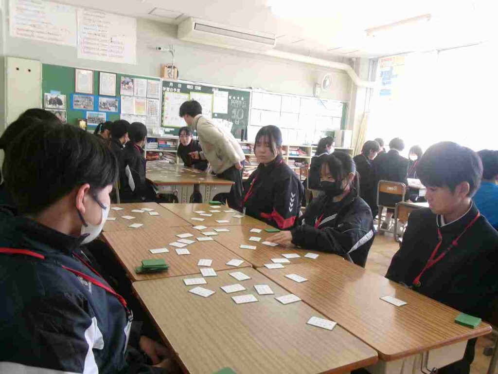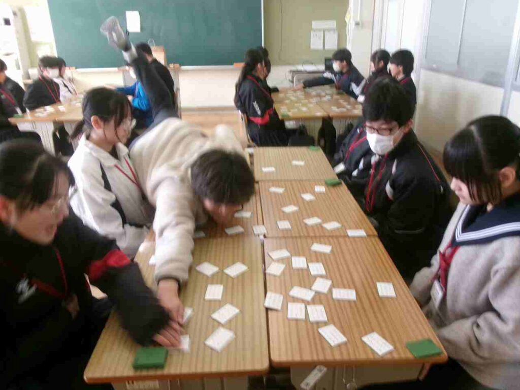 12/22(月)1年生はクラス対抗百人一首大会を行いました。1ヶ月余り、国語の授業の最後の時間に百人一首を暗唱し、かなりの枚数覚えている生徒も見られました。大会でも白熱した戦いが繰り広げられていました。百人一首を通して、歴史的仮名遣いや歌人の名前など学びになっているかと思います。ぜひ冬休み中、家族や親戚でもやってみてほしいです。