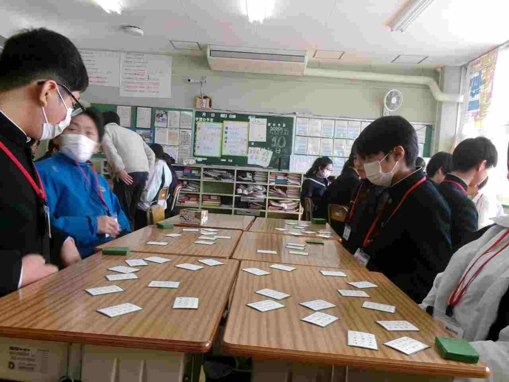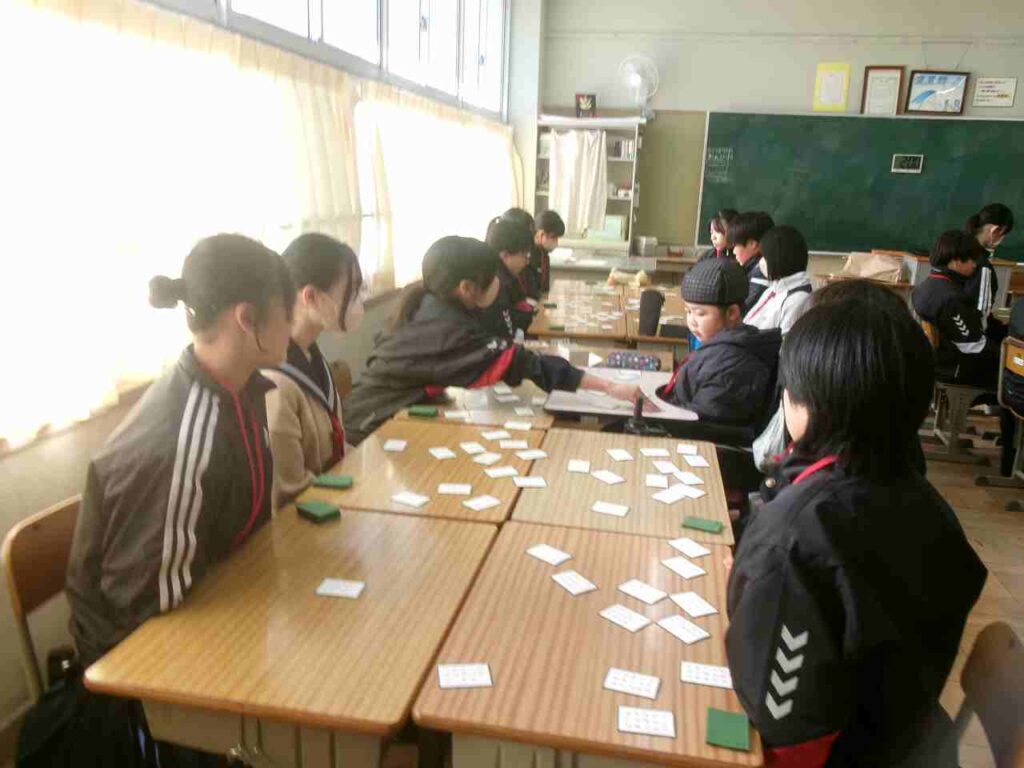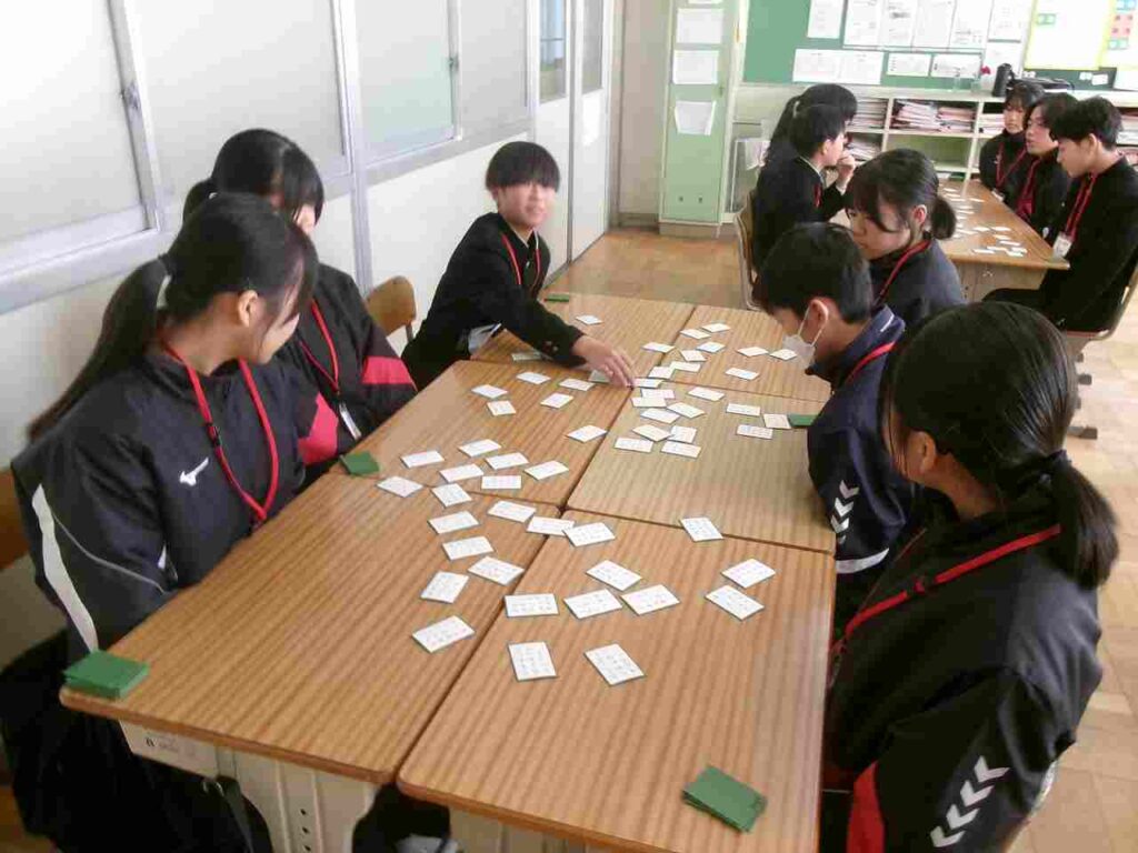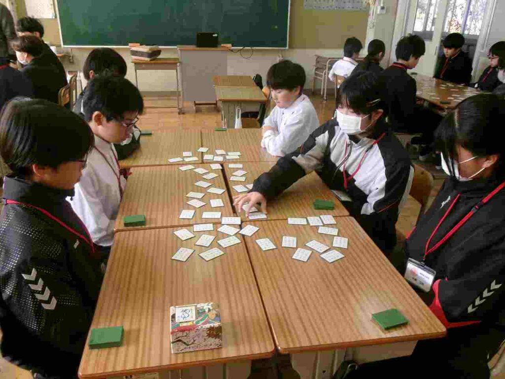 12/22(月)1年生はクラス対抗百人一首大会を行いました。1ヶ月余り、国語の授業の最後の時間に百人一首を暗唱し、かなりの枚数覚えている生徒も見られました。大会でも白熱した戦いが繰り広げられていました。百人一首を通して、歴史的仮名遣いや歌人の名前など学びになっているかと思います。ぜひ冬休み中、家族や親戚でもやってみてほしいです。