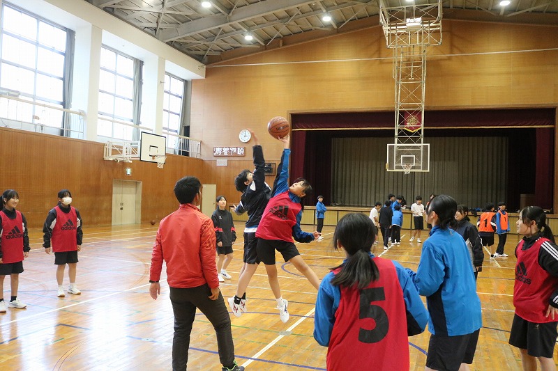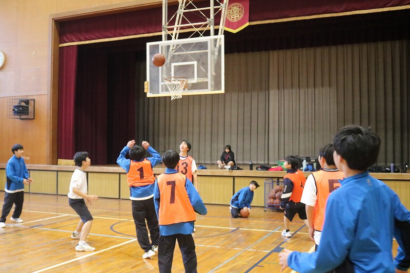 C組は、体育の授業でした。チームに分かれてバスケットボールの試合をしていました。どの試合も熱い戦いが繰り広げられていました。