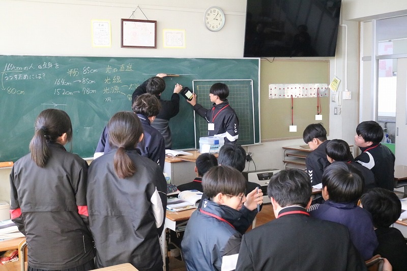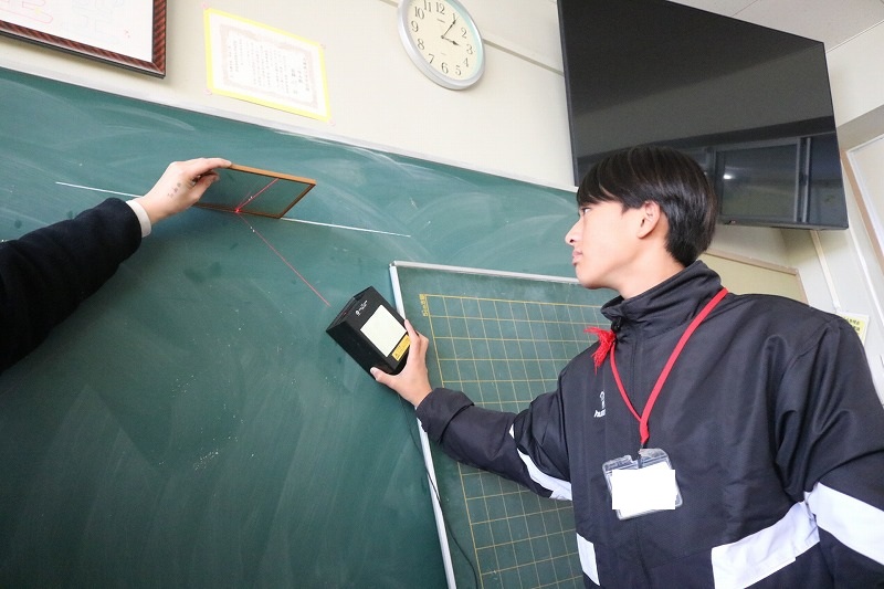 A組は、理科の授業でした。専用の機械を使い、光の道筋について学習しました。光を鏡で反射させると、どうはね返るか分かったかな。