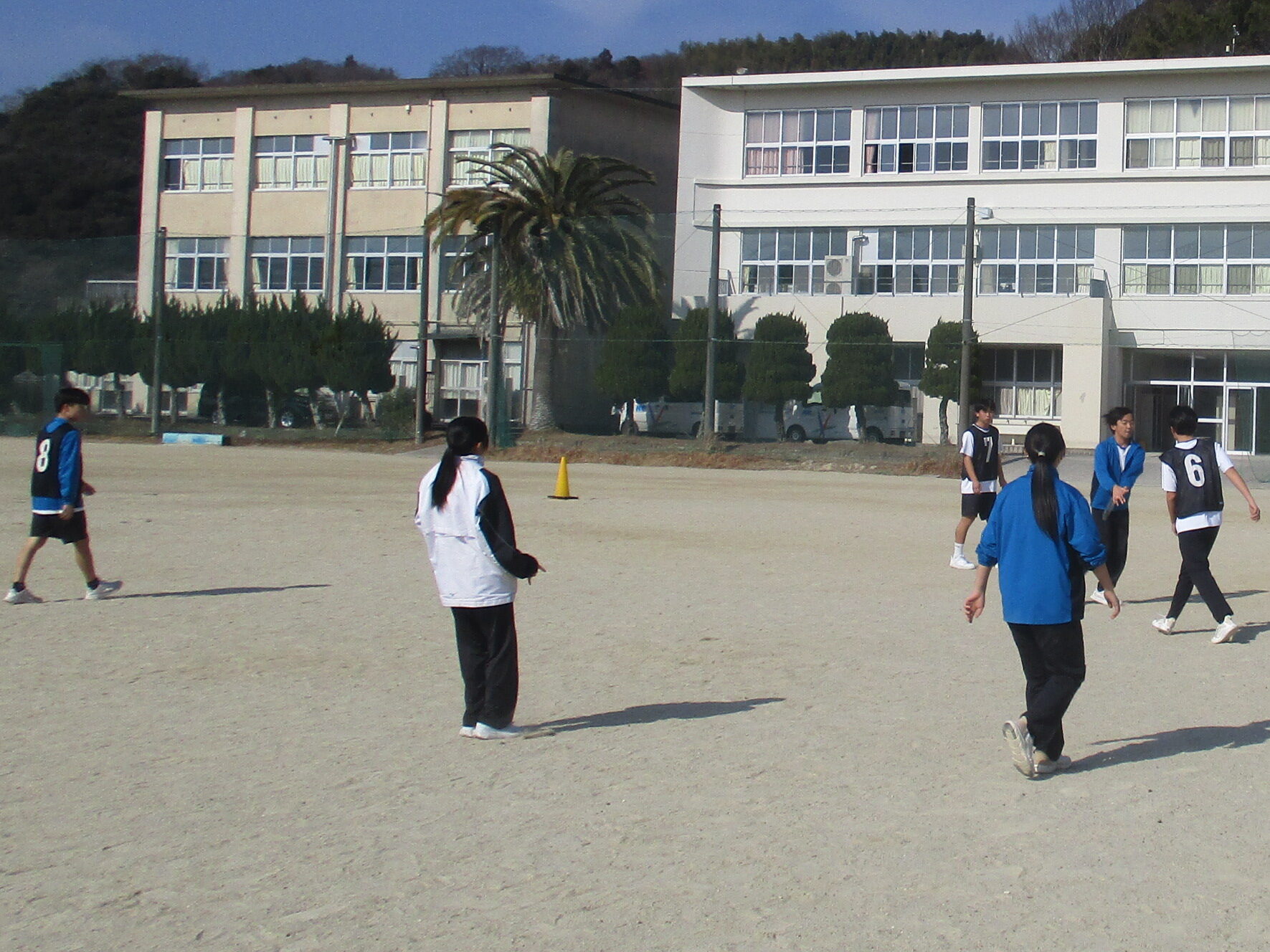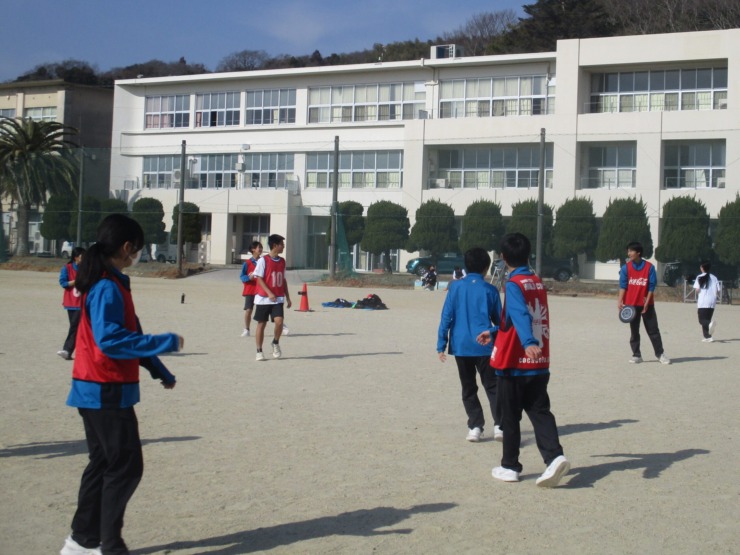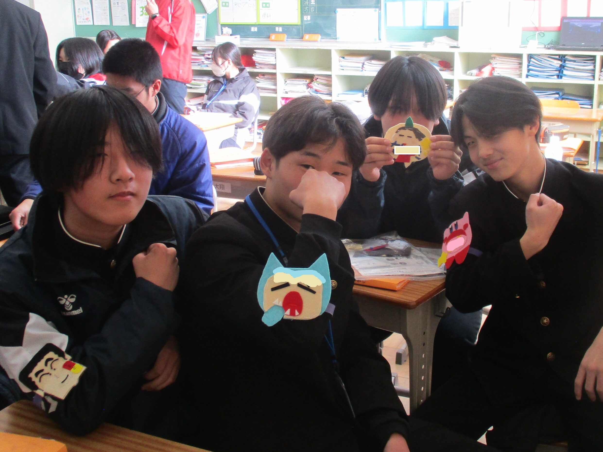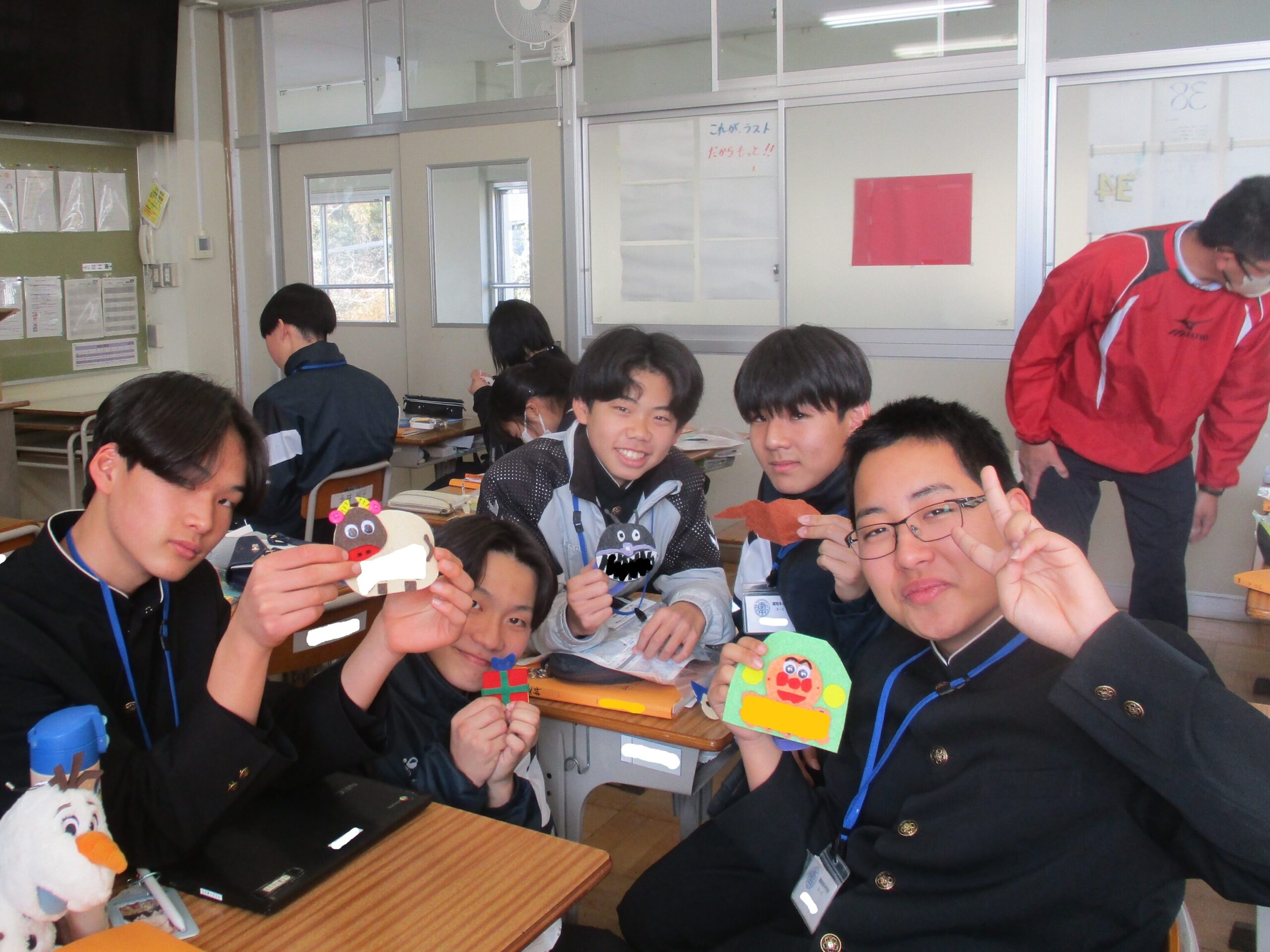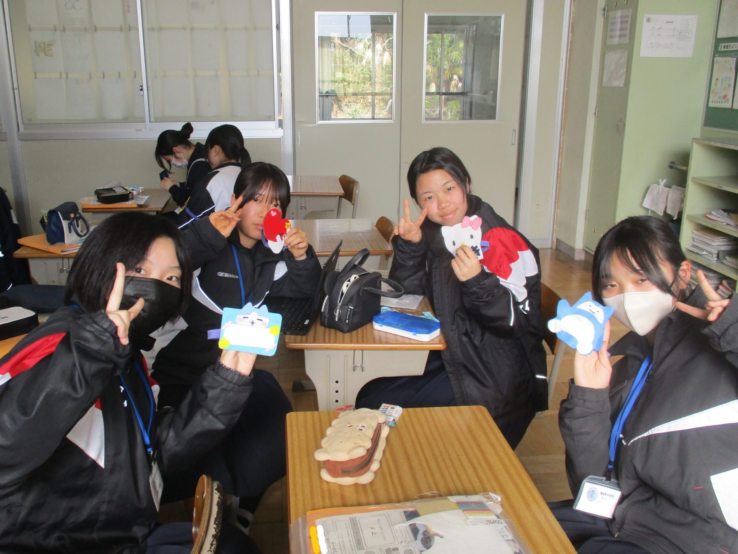 授業の様子です。A組は英語の総合的な問題に取り組んでいました。先生に教えてもらい「そうか!」と納得する声も聞こえてきました。着実に力を付けています。B組は体育でアルティメットのゲームをしていました。それぞれのチームで作戦があり見応えがありました。C組は家庭で保育所訪問に向けたワッペン作りをしていました。園児に喜んでもらえるようなデザインにして制作しました。