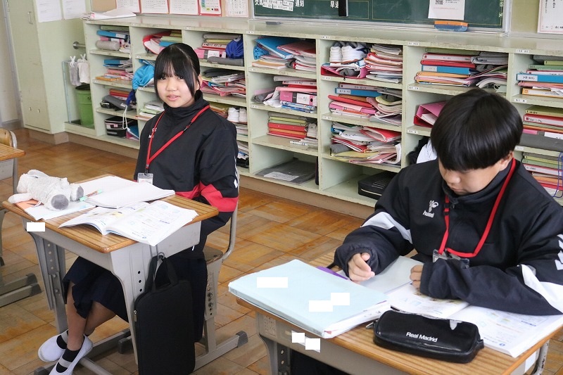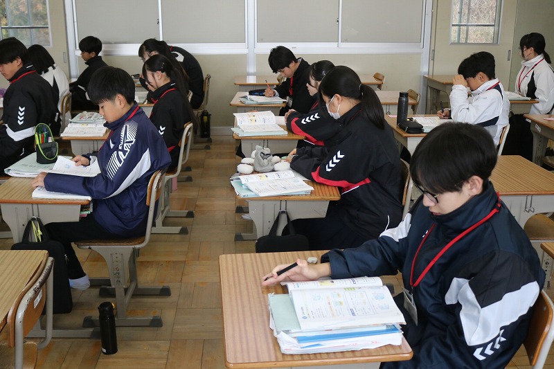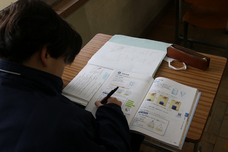 A組は数学の授業でした。立体の体積を一生懸命求めていました。体積を求める公式は覚えられたかな。2年後の受検では、1年生の学習内容からも出題されます。分からない問題をそのままにせず、一つ一つクリアしていこう!