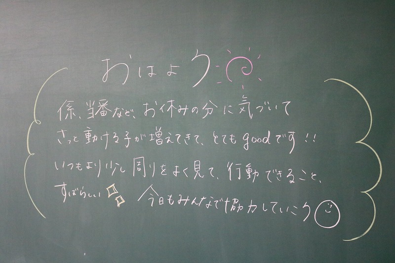 朝の教室の黒板です。担任からメッセージが書かれていました。入学してまもなく1年が経とうとしています。少しずつ少しずつ成長している姿に頼もしさを感じます。4月からは先輩という立場になります。1年生の残りの2ヶ月間でどう成長していくのか、楽しみです。