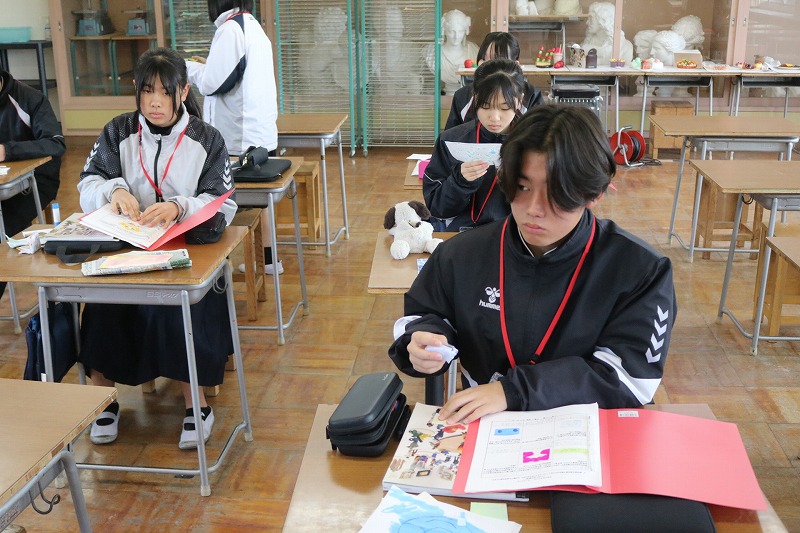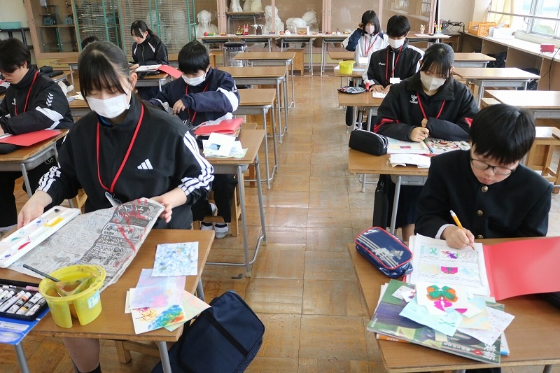 B組は美術の授業でした。「偶然を生かした作品づくり」という内容で、「マーブリング」や「ドリッピング」などのモダンテクニックの技法を習得していました。それぞれ色や形を工夫して、描くことができました。