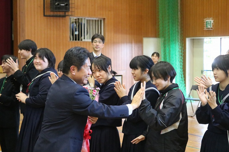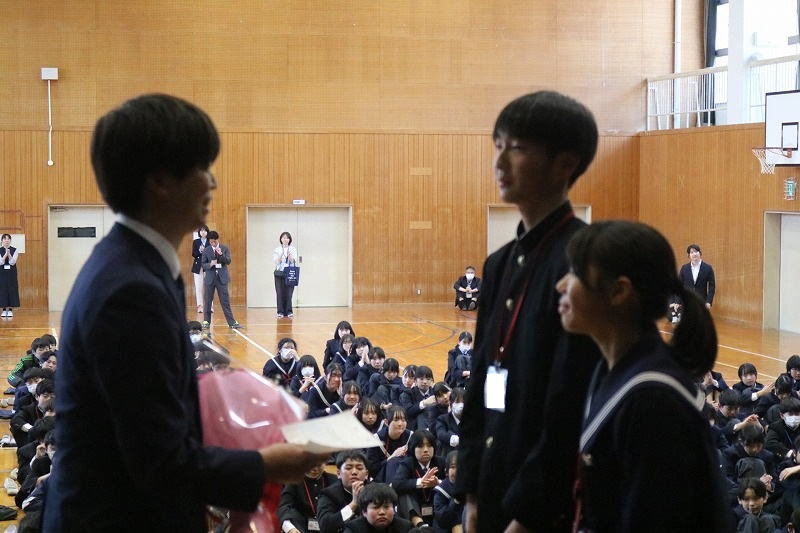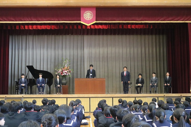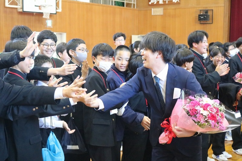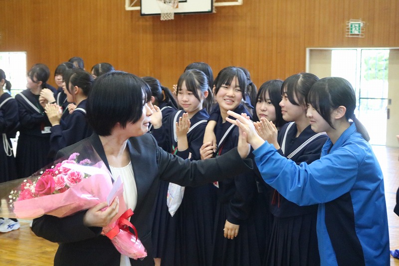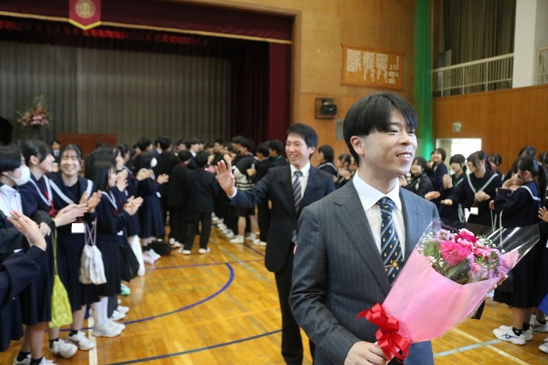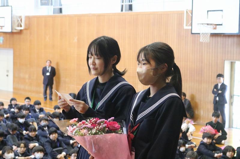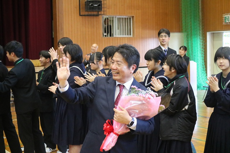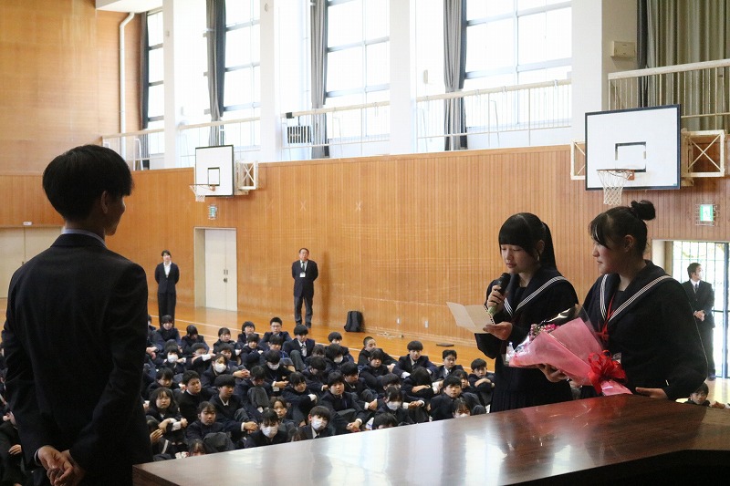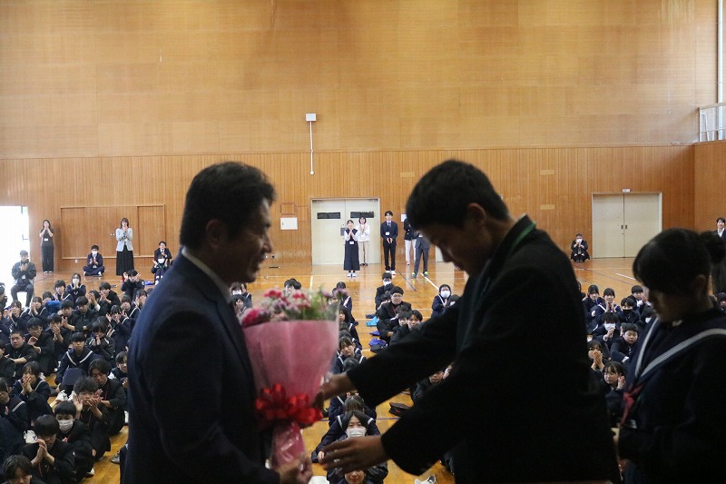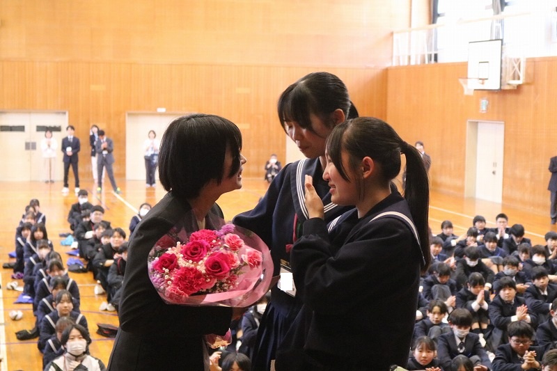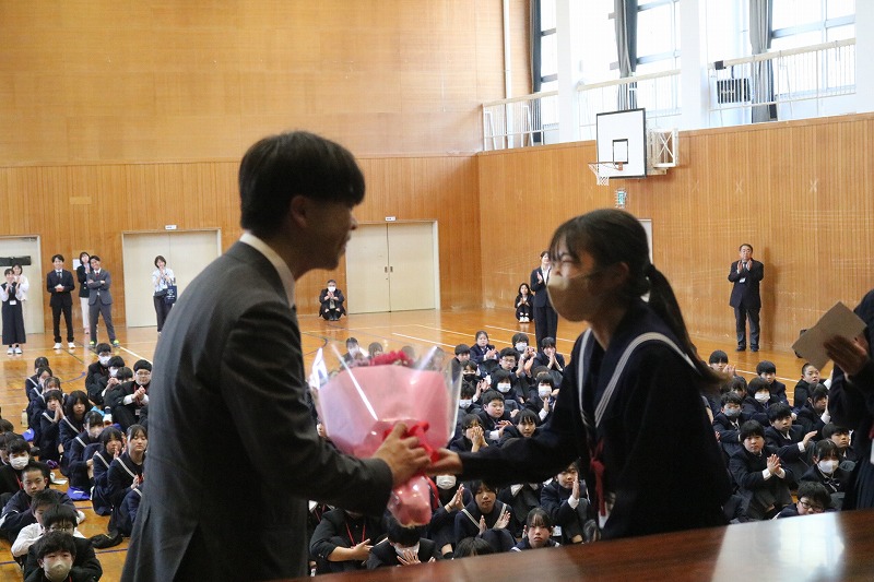 この4月の異動で、南知多中学校を去られた先生方をお招きし、離任式を行いました。去られる先生方との最後の時間を、全校生徒・教職員一同噛みしめながら、あたたかい時間を過ごしました。