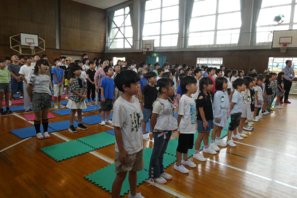 今朝は、朝会で後期役員の任命や夏休みの作品コンクールの表彰を行った後、20分間の運動会に向けて全校児童による「草取り大作戦」を行いました。環境委員会が準備をし、「一人100本」を目標に草取りを行いました。短い時間ではありましたが、一生懸命取り組みました。