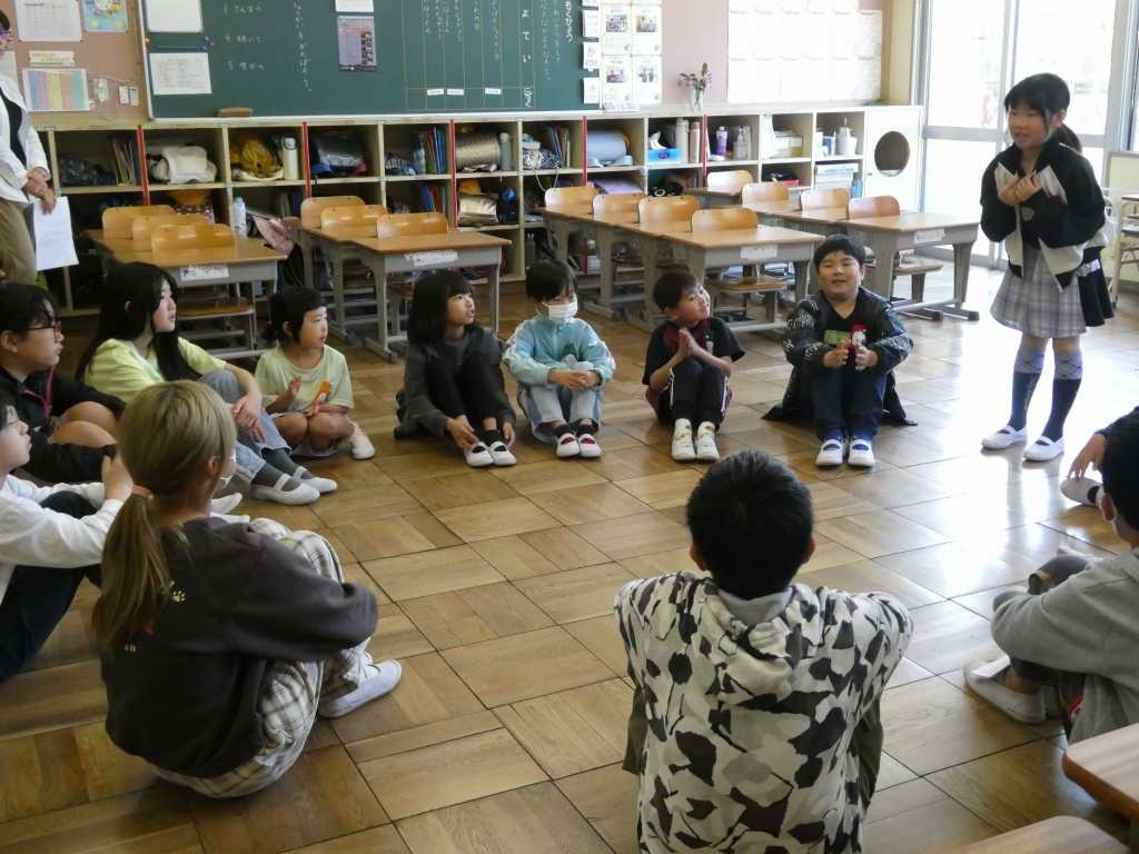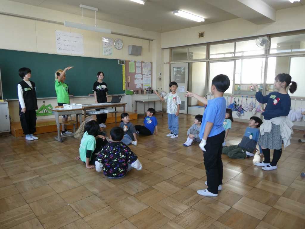 今日は、朝から曇り空。時折しとしと雨が降っています。外遊びができず、がっかりする子どもたち。落ち着いて授業に取り組みました。今年はALTの先生が変わりました。